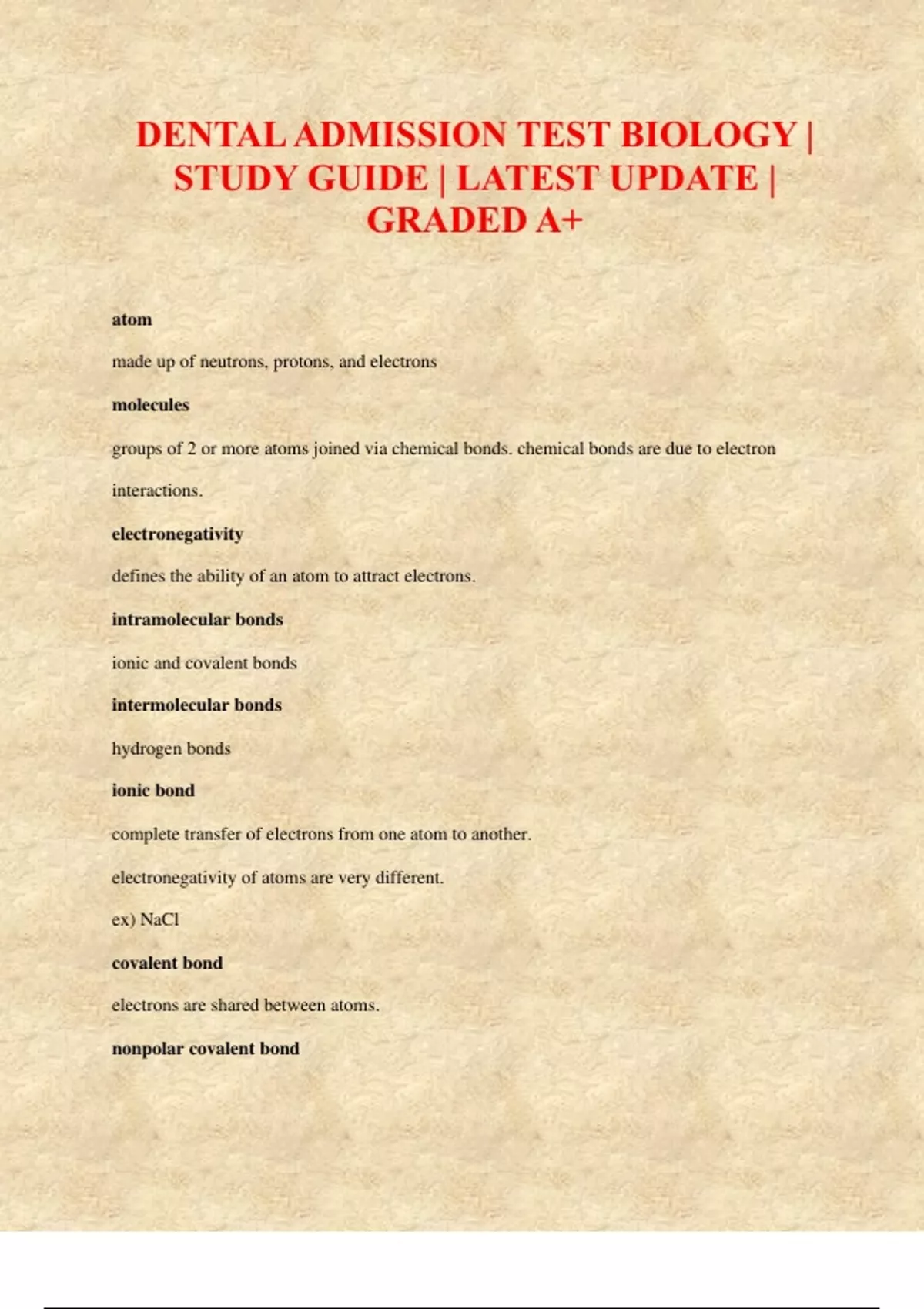 DENTAL ADMISSION TEST BIOLOGY | STUDY GUIDE | LATEST UPDATE | GRADED A+