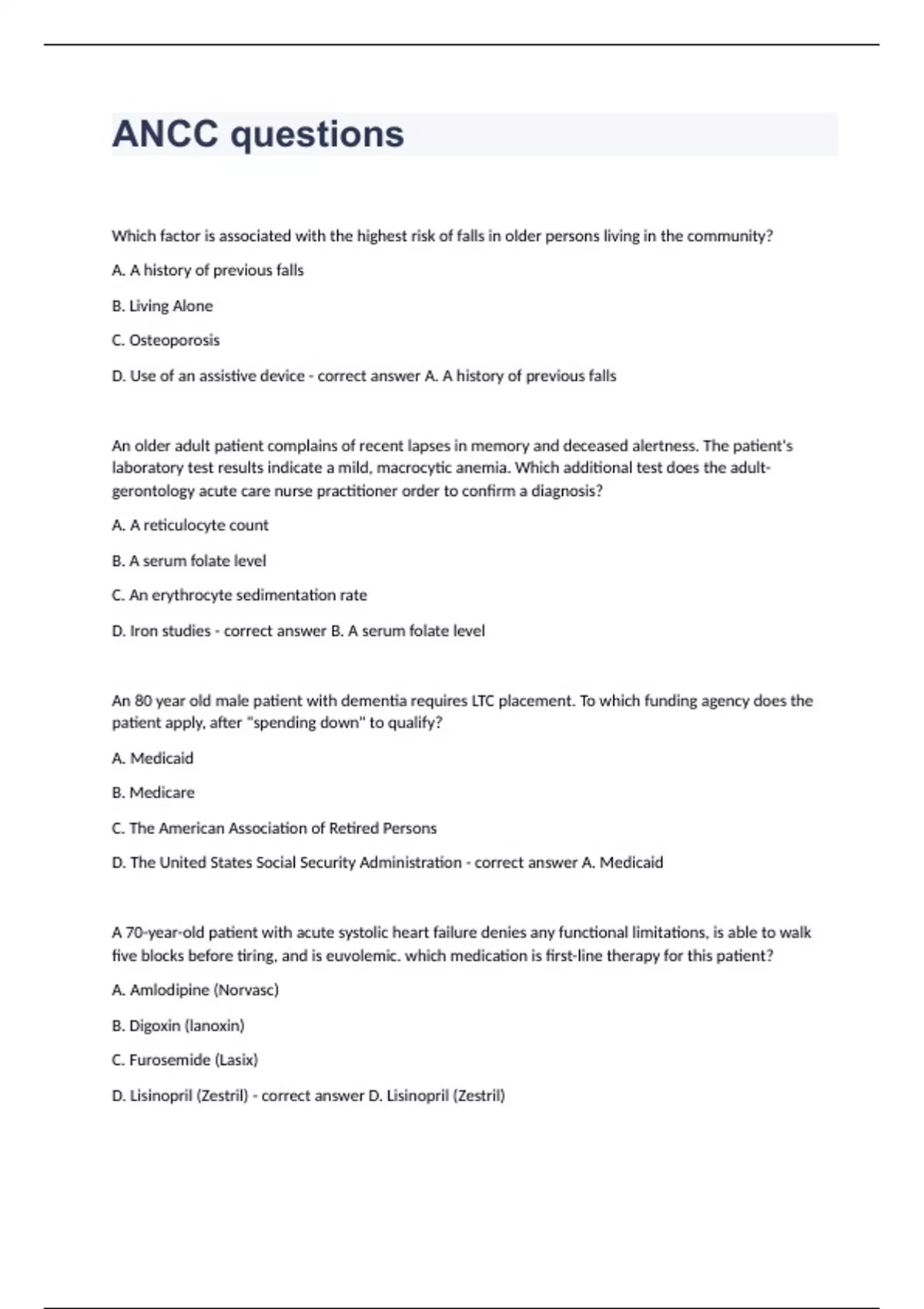 ANCC questions Which factor is associated with the highest risk of falls in older persons living in the community? A. A history of previous falls B. Living Alone C. Osteoporosis D. Use of an assistive device - correct answer A. A history of previous falls An older adult patient complains of recent lapses in memory and deceased alertness. The patient's laboratory test results indicate a mild, macrocytic anemia. Which additional test does the adult-gerontology acute care nurse practitioner order to confirm a diagnosis? A. A reticulocyte count B. A serum folate level C. An erythrocyte sedimentation rate D. Iron studies - correct answer B. A serum folate level An 80 year old male patient with dementia requires LTC placement. To which funding agency does the patient apply, after "spending down" to qualify? A. Medicaid B. Medicare C. The American Association of Retired Persons D. The United States Social Security Administration - correct answer A. Medicaid A 70-year-old patient with acute systolic heart failure denies any functional limitations, is able to walk five blocks before tiring, and is euvolemic. which medication is first-line therapy for this patient? A. Amlodipine (Norvasc) B. Digoxin (lanoxin) C. Furosemide (Lasix) D. Lisinopril (Zestril) - correct answer D. Lisinopril (Zestril) A patient has hyperactive reflexes of the lower extremities. The adult-gerontology acute care nurse practitioner assesses for ankle clonus by A. applying a low-pitched tuning fork firmly to the lateral malleolus B. Sharply dosiflexing and maintaining the foot in this position, while supporting the knee. C. Striking the Achilles tendon with the percussion hammer after flexing the leg at the knee and rotating it externally. D. Stroking the lateral aspect of the sole with the sharp end of the percussion hammer from the heel to the ball of the foot. - correct answer B. Sharply dosiflexing and maintaining the foot in this position, while supporting the knee. A 15-year-old patient with type 1 Diabetes reports elevated blood glucose levels in the morning. An AGACNP determines that the patient's hyperglycemia is due to the dawn phenomenon and: A. increases the insulin dosage at bed time B. reduces the insulin dosage at bed time C. Tests the blood glucose level at 3am every morning D. Tests the blood glucose level in the evening - correct answer A. increases the insulin dosage at bedtime A patient with profound hypotension is transferred from the med-surg unit to the ICU. The patient is started on fluids and norepinephrine (Levophed) IV. The blood cultures that were drawn 48h ago from the tunneled catheter, show preliminary results of gram-negative bacilli. The patients most recent ECHO report reveals an ejection fraction of 40%. The AGACNP determines that: A. a pulmonary catheter insertion is indicated, to manage septic shock B. fluid resuscitation will be limited to no more than 4 liters C. indwelling vancomycin (Vancocin) should be placed in the ports of the tunneled catheter D. piperacillin-tazobactam (Zosyn) is indicated for the line-related infection - correct answer D. piperacillin-tazobactam (Zosyn) is indicated for the line-related infection Which research design has the greatest strength in determining if an intervention is effective? A. Case control B. Clinical Trial