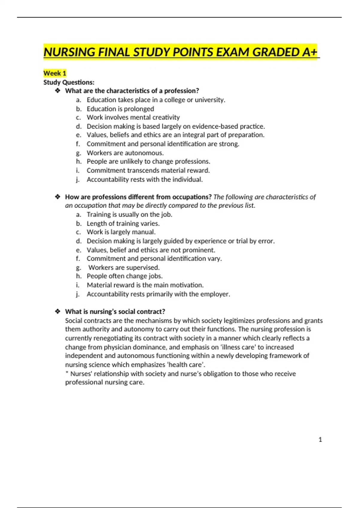 NURSING FINAL STUDY POINTS EXAM GRADED A+