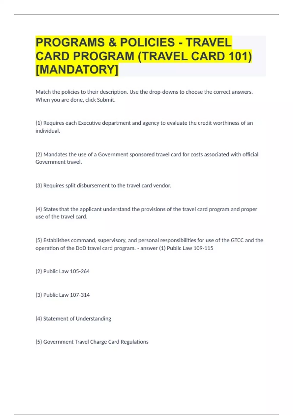 Match the policies to their description. Use the drop-downs to choose the correct answers. When you are done, click Submit. (1) Requires each Executive department and agency to evaluate the credit worthiness of an individual. (2) Mandates the use of a Government sponsored travel card for costs associated with official Government travel. (3) Requires split disbursement to the travel card vendor. (4) States that the applicant understand the provisions of the travel card program and proper use of the travel card. (5) Establishes command, supervisory, and personal responsibilities for use of the GTCC and the operation of the DoD travel card program. (1) Public Law 109-115 (2) Public Law 105-264 (3) Public Law 107-314 (4) Statement of Understanding (5) Government Travel Charge Card Regulations Betty, a cardholder, receives a call inquiring about her SSN. The caller introduces himself as an employee of the travel card vendor and tells her that he needs her SSN to verify the validity of the card. What should betty do? Betty should not provide the information because she is unsure about the legitimacy of the call. Jackie, a restricted cardholder, performed TDY at a U.S. military installation. She used her card to purchase airline tickets and other travel-related expenses totaling $250. How much of her total credit limit remains? $3750 For the purpose of obtaining a card, does how often you travel on official business in a year determine if you are required to use the travel card? No Complete the statements by selecting the correct answer. After you are done, click Submit. (1) The ATM withdrawal limit for a standard cardholder is: (2) The cardholder, not the Government, is liable for payments for: (3) The card that limits the cardholder to a minimal amount of credit and must be activated and deactivated for official travel periods is the: (1) $250 (2) IBA travel cards (3) restricted card click and drag to arrange the steps in the correct sequence. After you are done, click Submit. Step 3 - Applicant informs APC of travel card request. Step 5 - Applicant completes online application and provides signed SoU and Travel Card 101 completion certificate to APC. Step 1 - APC verifies, completes, and approves the application. Step 2 - Applicant receives travel card. Step 4 - Cardholder reads the cardholder agreement, signs it, verifies receipt of the travel card, and updates their DTS profile with the new travel card information. Tom, a cardholder, was recently transferred from Edwards Air Force Base, California to Offutt Air Force Base, Nebraska. Who should he notify regarding his change of address for travel card matters? Travel card vendor and APC Which of the following statements about Reduced Payment Plans is incorrect? RPPs can be established after an account is placed into Salary Offset Match the travel card policies to their descriptions. (1) The travel card vendor receives direct payment for the amount of travel card expenses specified in the travel voucher. (2) DoD, on behalf of the travel card vendor, automatically collects payment from the cardholder's pay for any amount owed as a result of undisputed delinquencies. (3) Individuals are deployed on long-term travel to locations that preclude them from filing interim vouchers (non-DTS). (4) A written agreement between the cardholder and the travel card vendor in which the cardholder agrees to make a monthly payment to the vendor. (1) Split Disbursement (2) Salary Offset (3) Mission Critical Status (4) Reduced Payment Plan Which item is a benefit of using the travel card? Using it prevents travelers form having to use their own money for official travel expenses. Which statement about an individually billed account (IBA) is true? Regardless of the status of the traveler's reimbursement, they must pay their bill on time. Which situation will most likely result in an individual being issued a restricted travel card? The traveler refuses to authorize a credit score check. Patricia is preparing to go TDY. Which of the following is NOT an action she should take to prepare? Hold onto vouchers from earlier trips, so she can process them all together when she returns. Vanessa is applying for an IBA. She completed the online application form and then completed the Program & Policies - Travel Card Program [Travel Card 101] training class and provided a copy of her completion certificate to her APC. What does Vanessa need to do next before she can receive a travel card? Sign a DoD Statement of Understanding and provide it to her APC.