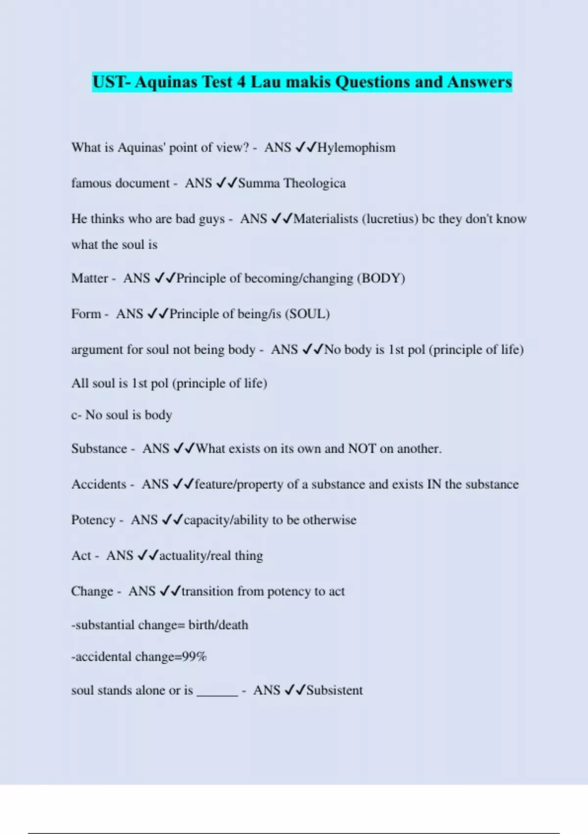 UST- Aquinas Test 4 Lau makis Questions and Answers What is Aquinas' point of view? - ANS ️️ Hylemophism famous document - ANS ️️ Summa Theologica He thinks who are bad guys - ANS ️️ Materialists (lucretius) bc they don't know what the soul is Matter - ANS ️️ Principle of becoming/changing (BODY) Form - ANS ️️ Principle of being/is (SOUL) argument for soul not being body - ANS ️️ No body is 1st pol (principle of life) All soul is 1st pol (principle of life) c- No soul is body Substance - ANS ️️ What exists on its own and NOT on another. Accidents - ANS ️️ feature/property of a substance and exists IN the substance Potency - ANS ️️ capacity/ability to be otherwise Act - ANS ️️ actuality/real thing Change - ANS ️️ transition from potency to act -substantial change= birth/death -accidental change=99% soul stands alone or is ______ - ANS ️️ Subsistent