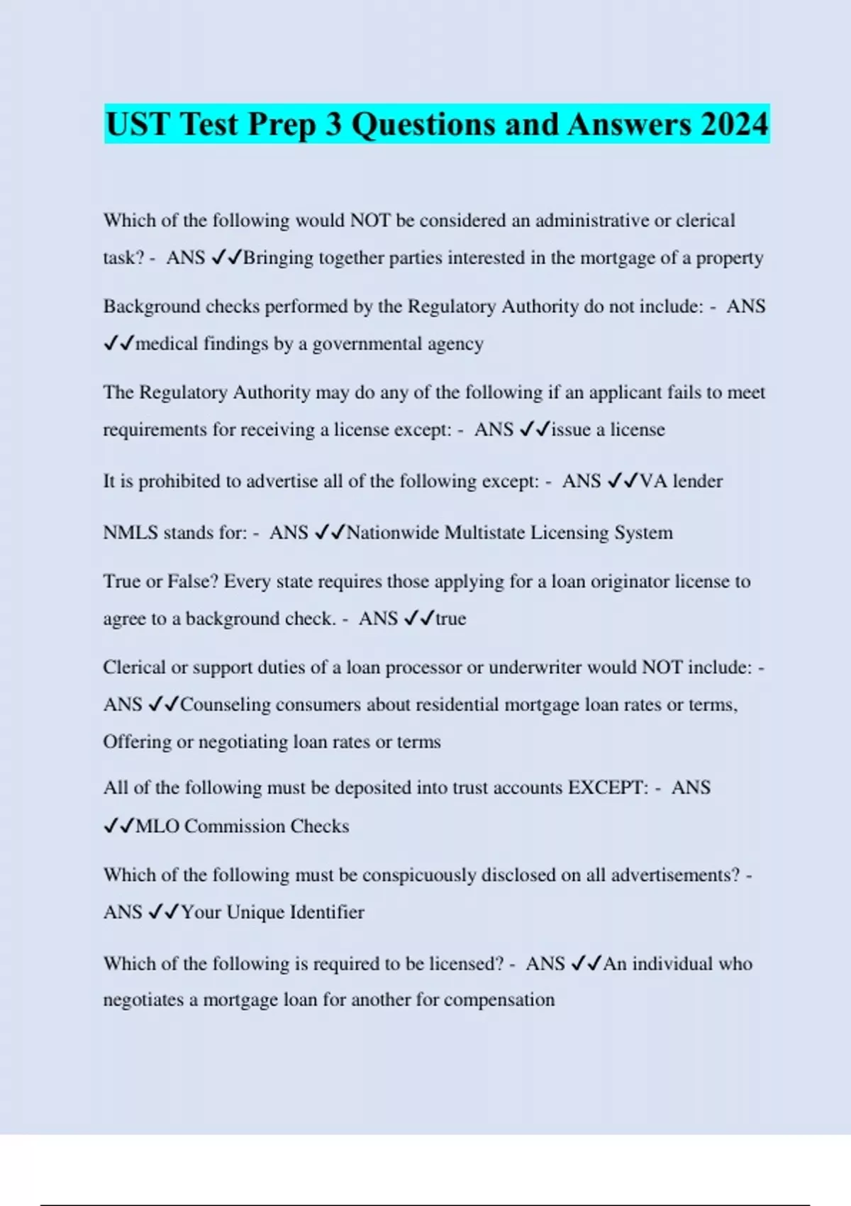 UST Test Prep 3 Questions and Answers 2024 Which of the following would NOT be considered an administrative or clerical task? - ANS ️️ Bringing together parties interested in the mortgage of a property Background checks performed by the Regulatory Authority do not include: - ANS ️️ medical findings by a governmental agency The Regulatory Authority may do any of the following if an applicant fails to meet requirements for receiving a license except: - ANS ️️ issue a license It is prohibited to advertise all of the following except: - ANS ️️ VA lender NMLS stands for: - ANS ️️ Nationwide Multistate Licensing System True or False? Every state requires those applying for a loan originator license to agree to a background check. - ANS ️️ true Clerical or support duties of a loan processor or underwriter would NOT include: - ANS ️️ Counseling consumers about residential mortgage loan rates or terms, Offering or negotiating loan rates or terms All of the following must be deposited into trust accounts EXCEPT: - ANS ️️ MLO Commission Checks Which of the following must be conspicuously disclosed on all advertisements? - ANS ️️ Your Unique Identifier Which of the following is required to be licensed? - ANS ️️ An individual who negotiates a mortgage loan for another for compensation