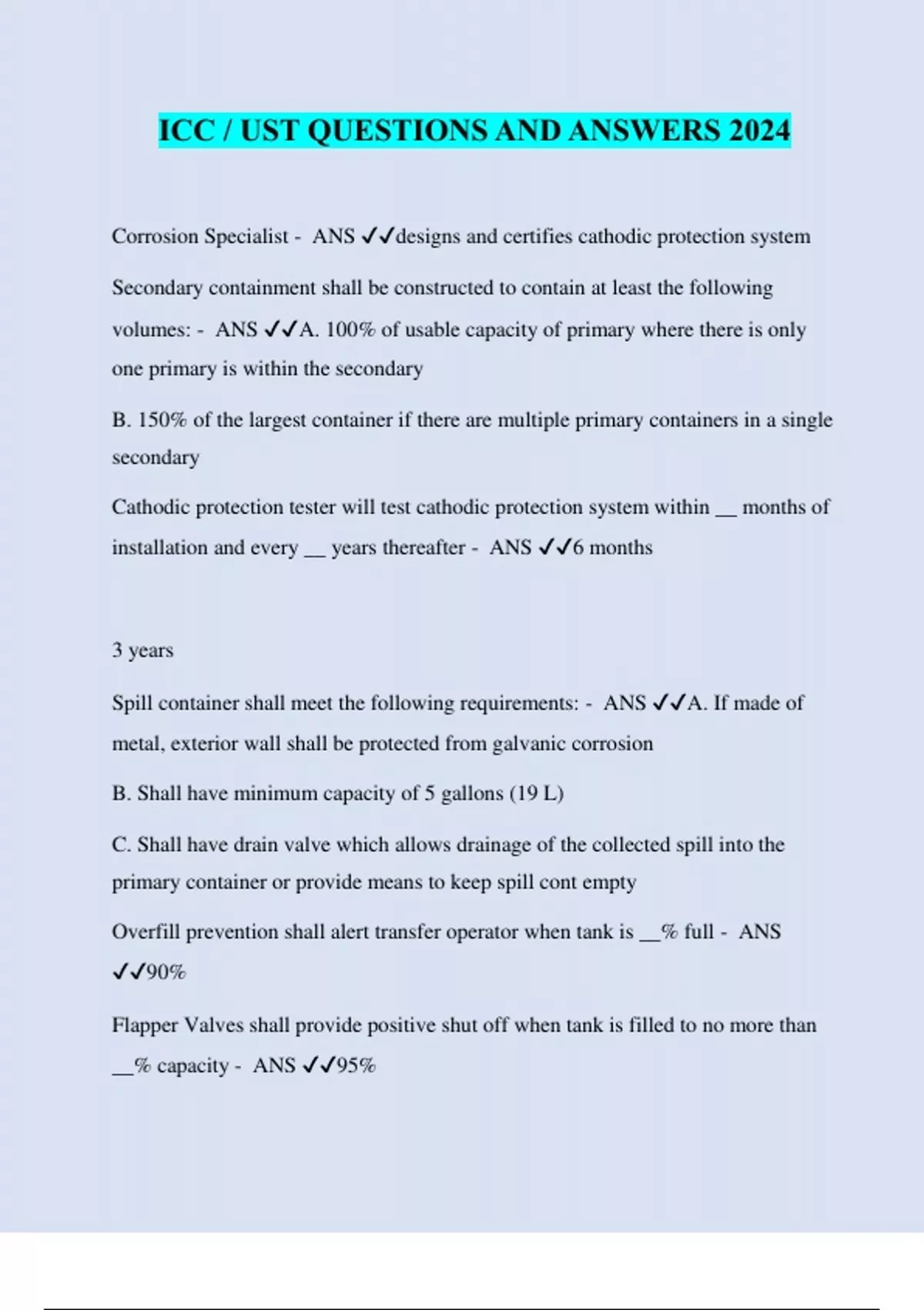 ICC / UST QUESTIONS AND ANSWERS 2024 Corrosion Specialist - ANS ️️ designs and certifies cathodic protection system Secondary containment shall be constructed to contain at least the following volumes: - ANS ️️ A. 100% of usable capacity of primary where there is only one primary is within the secondary B. 150% of the largest container if there are multiple primary containers in a single secondary Cathodic protection tester will test cathodic protection system within __ months of installation and every __ years thereafter - ANS ️️ 6 months 3 years Spill container shall meet the following requirements: - ANS ️️ A. If made of metal, exterior wall shall be protected from galvanic corrosion B. Shall have minimum capacity of 5 gallons (19 L) C. Shall have drain valve which allows drainage of the collected spill into the primary container or provide means to keep spill cont empty Overfill prevention shall alert transfer operator when tank is __% full - ANS ️️ 90% Flapper Valves shall provide positive shut off when tank is filled to no more than __% capacity - ANS ️️ 95%