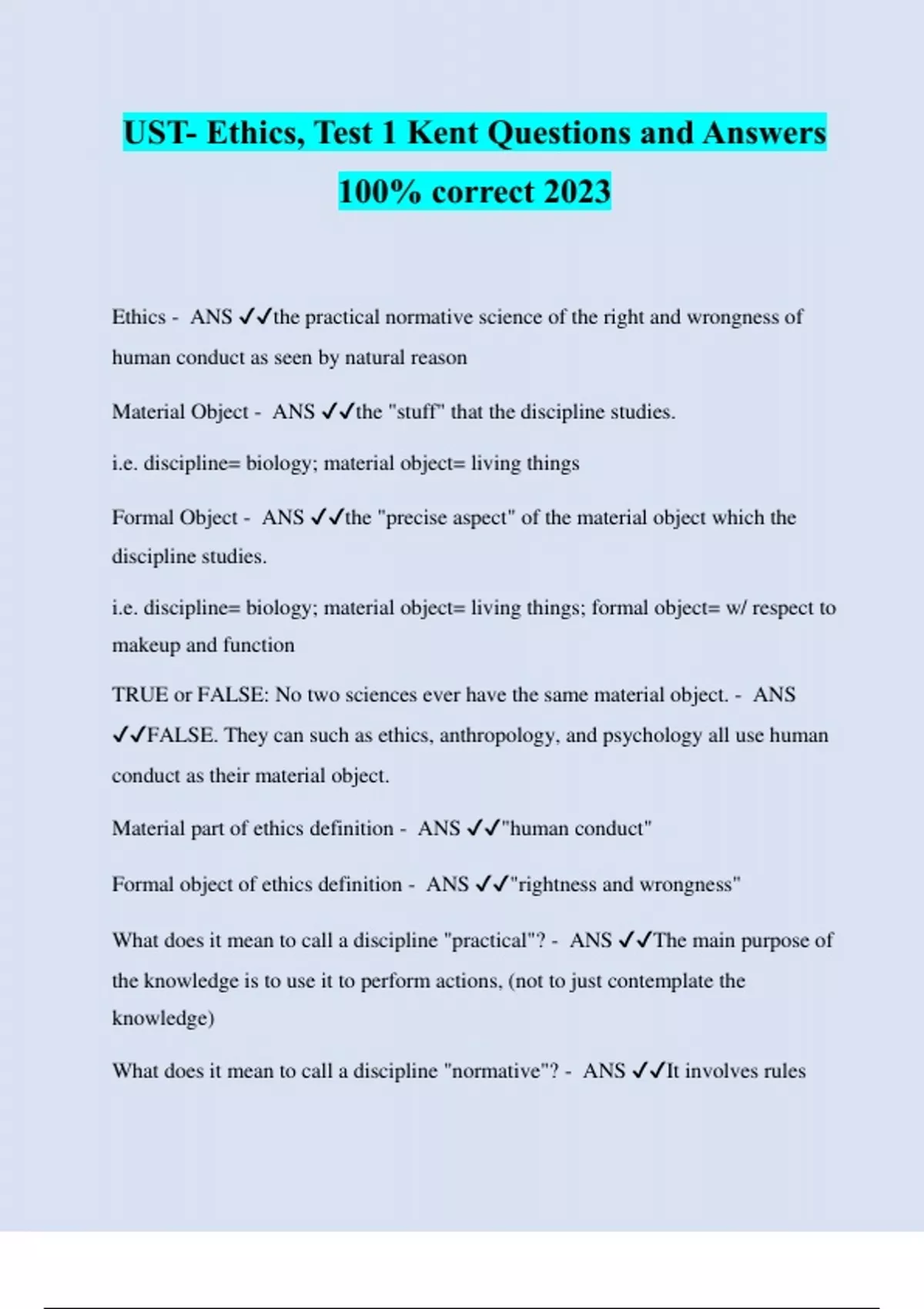UST- Ethics, Test 1 Kent Questions and Answers 100% correct 2023 Ethics - ANS ️️ the practical normative science of the right and wrongness of human conduct as seen by natural reason Material Object - ANS ️️ the "stuff" that the discipline studies. i.e. discipline= biology; material object= living things Formal Object - ANS ️️ the "precise aspect" of the material object which the discipline studies. i.e. discipline= biology; material object= living things; formal object= w/ respect to makeup and function TRUE or FALSE: No two sciences ever have the same material object. - ANS ️️ FALSE. They can such as ethics, anthropology, and psychology all use human conduct as their material object. Material part of ethics definition - ANS ️️ "human conduct" Formal object of ethics definition - ANS ️️ "rightness and wrongness" What does it mean to call a discipline "practical"? - ANS ️️ The main purpose of the knowledge is to use it to perform actions, (not to just contemplate the knowledge) What does it mean to call a discipline "normative"? - ANS ️️ It involves rules