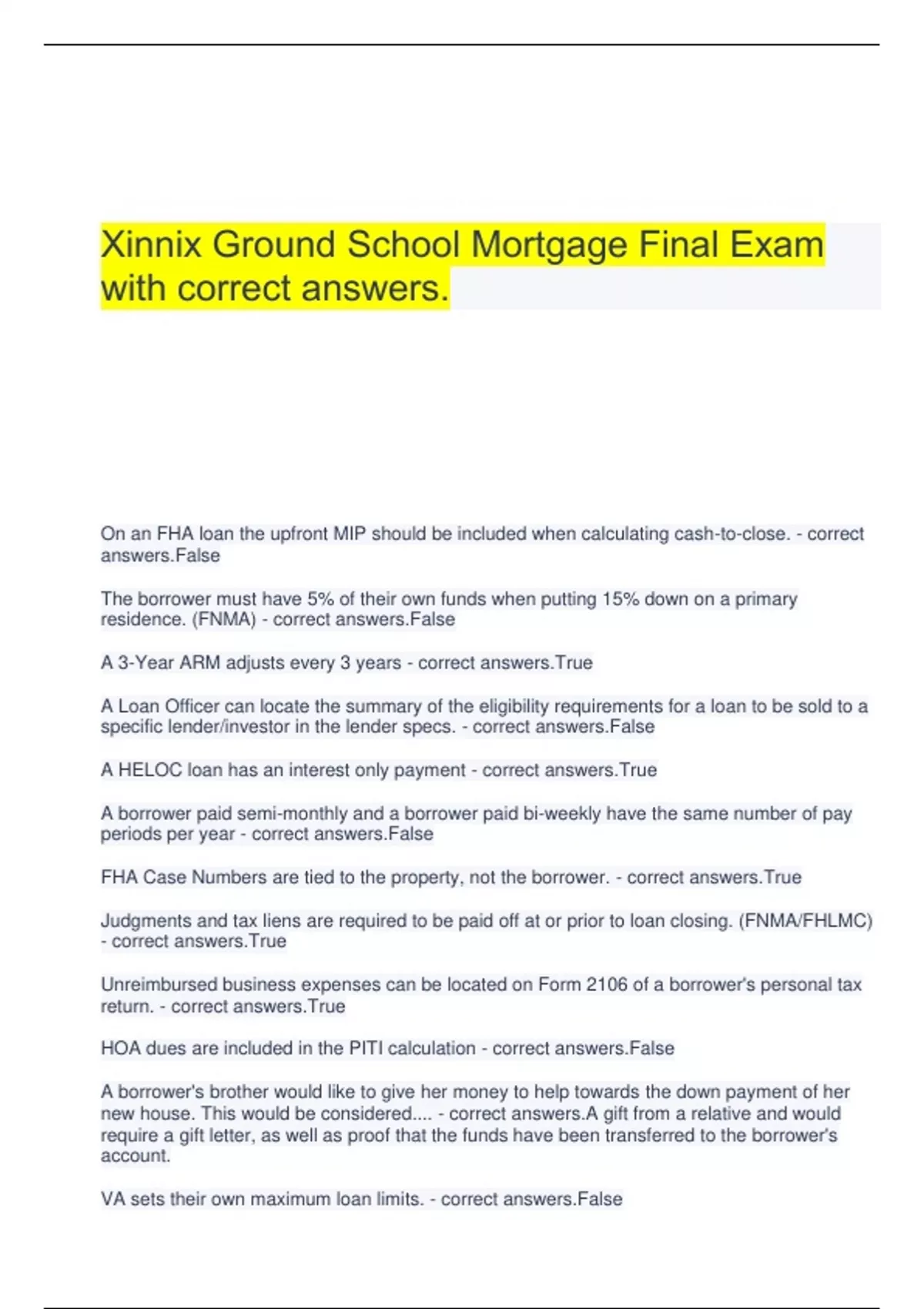 Xinnix Ground School Mortgage Final Exam with correct answers. On an FHA loan the upfront MIP should be included when calculating cash-to-close. - correct answers.False The borrower must have 5% of their own funds when putting 15% down on a primary residence. (FNMA) - correct answers.False A 3-Year ARM adjusts every 3 years - correct answers.True A Loan Officer can locate the summary of the eligibility requirements for a loan to be sold to a specific lender/investor in the lender specs. - correct answers.False A HELOC loan has an interest only payment - correct answers.True A borrower paid semi-monthly and a borrower paid bi-weekly have the same number of pay periods per year - correct answers.False FHA Case Numbers are tied to the property, not the borrower. - correct answers.True Judgments and tax liens are required to be paid off at or prior to loan closing. (FNMA/FHLMC) - correct answers.True Unreimbursed business expenses can be located on Form 2106 of a borrower's personal tax return. - correct answers.True HOA dues are included in the PITI calculation - correct answers.False A borrower's brother would like to give her money to help towards the down payment of her new house. This would be considered.... - correct answers.A gift from a relative and would require a gift letter, as well as proof that the funds have been transferred to the borrower's account. VA sets their own maximum loan limits. - correct answers.False The monthly MI for an FHA loan is calculated by BASE Loan Amount x .85% /12 - correct answers.True Redisclosure of the Truth in Lending is required if the PAR changes more than _____% on a fixed rate loan? - correct answers..125 If a veteran has previously used their VA entitlement and it has not yet been restored, their COE may show an available amount which is less that the VA maximum allowable entitlement - correct answers.True A room addition is allowed under the FHA 203(k) Limited program. - correct answers.False The maximum allowable ratios for an owner-occupant when using a non-occupant co-borrower per FHLMC guidelines is ______________. - correct answers.35/43 A borrower is considering a 1-year ARM with a note rate of 4.25%, 2/6 caps and a margin of 2.5%. What would the borrower's interest rate be for year 2 if the index is at 4.25%? - correct answers.6.25% The builder must provide an appraisal certificate to the mortgage company on an FHA new construction loan prior to closing. - correct answers.False All of the following documents must be provided by the builder to the mortgage company on an FHA new construction loan prior to the loan being cleared to close EXCEPT: - correct answers.Appraisal Certificate MUST BE PROVIDED: Certificate of Occupancy, Builder's 1-Year Warranty, Insulation Certificate After the borrower submits a complete loan application, the LE must be delivered or placed in the mail within how many days? - correct answers.3 business days Which document is not necessary for the builder provide to the mortgage company on an FHA new construction loan prior to the loan being cleared to close? - correct answers.Appraisal Certificate Ms. Armstrong is paid an hourly wage of $17.50. She receives time and a half for overtime (more than 40 hours per week) and has been averaging 50 hours every week, since starting with the company five years ago. Her current paystub from 7/15 of this year shows a YTD gross income of $26,260. Her W2 from last year shows $48,048 and the year before shows $46,116. What is the monthly base income and monthly overtime income that would be entered on the 1003? (Overtime not guaranteed) - correct answers.$3033/$915 Choose the correct relationship between the Name of the Report and mortgage interest rate tendencies. - correct answers.When the CPI goes UP, Rates tend to go UP When the GDP goes DOWN, rates tend to go DOWN When the Unemployment Rate goes UP, rates tend to go DOWN The following are types of renovation mortgages: - correct answers.FNMA HomeStyle, FHA 203(k)