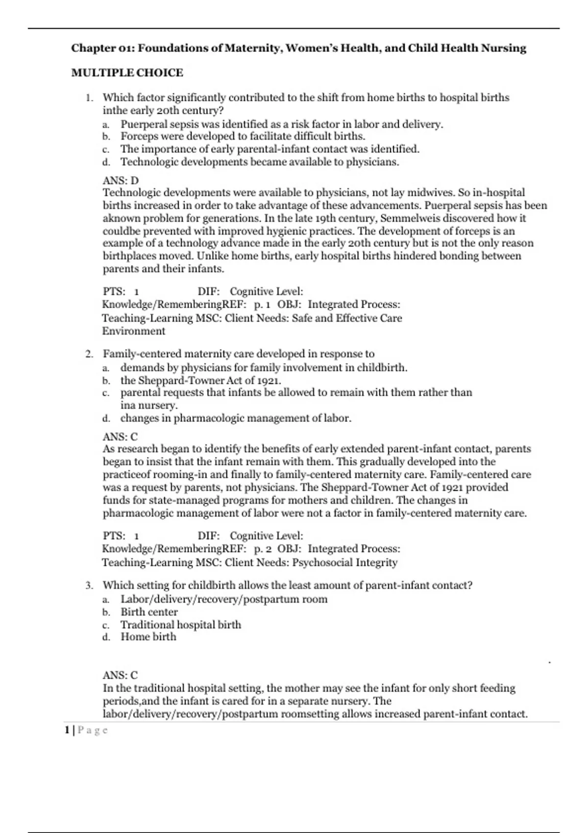 TEST BANK MCKINNEY; EVOLVE RESOURCES FOR MATERNAL-CHILD NURSING, 5TH EDITION TEST BANKChapter 01: Foundations of Maternity, Women’s Health, and Child Health Nursing MULTIPLE CHOICE 1. Which factor significantly contributed to the shift from home births to hospital births in the early 20th century? a. Puerperal sepsis was identified as a risk factor in labor and delivery. b. Forceps were developed to facilitate difficult births. c. The importance of early parental-infant contact was identified. d. Technologic developments became available to physicians. ANS: D Technologic developments were available to physicians, not lay midwives. So in-hospital births increased in order to take advantage of these advancements. Puerperal sepsis has been a known problem for generations. In the late 19th century, Semmelweis discovered how it could be prevented with improved hygienic practices. The development of forceps is an example of a technology advance made in the early 20th century but is not the only reason birthplaces moved. Unlike home births, early hospital births hindered bonding between parents and their infants. PTS: 1 DIF: Cognitive Level: Knowledge/Remembering REF: p. 1 OBJ: Integrated Process: Teaching-Learning MSC: Client Needs: Safe and Effective Care Environment 2. Family-centered maternity care developed in response to a. demands by physicians for family involvement in childbirth. b. the Sheppard-Towner Act of 1921. c. parental requests that infants be allowed to remain with them rather than in a nursery. d. changes in pharmacologic management of labor. ANS: C As research began to identify the benefits of early extended parent-infant contact, parents began to insist that the infant remain with them. This gradually developed into the practice of rooming-in and finally to family-centered maternity care. Family-centered care was a request by parents, not physicians. The Sheppard-Towner Act of 1921 provided funds for state-managed programs for mothers and children. The changes in pharmacologic management of labor were not a factor in family-centered maternity care. PTS: 1 DIF: Cognitive Level: Knowledge/Remembering REF: p. 2 OBJ: Integrated Process: Teaching-Learning MSC: Client Needs: Psychosocial Integrity 3. Which setting for childbirth allows the least amount of parent-infant contact? a. Labor/delivery/recovery/postpartum room b. Birth center c. Traditional hospital birth d. Home birth . ANS: C In the traditional hospital setting, the mother may see the infant for only short feeding periods, and the infant is cared for in a separate nursery. The labor/delivery/recovery/postpartum room setting allows increased parent-infant contact. 1 | P a g eBirth centers are set up to allow an increase in parent-infant contact. Home births allow an increase in parent-infant contact. PTS: 1 DIF: Cognitive Level: Knowledge/Remembering REF: p. 2 OBJ: Nursing Process: Planning MSC: Client Needs: Health Promotion and Maintenance 4. As a result of changes in health care delivery and funding, a current trend seen in the pediatric setting is a. increased hospitalization of children. b. decreased number of children living in poverty. c. an increase in ambulatory care. d. decreased use of managed care. ANS: C One effect of managed care has been that pediatric health care delivery has shifted dramatically from the acute care setting to the ambulatory setting in order to provide more cost-efficient care. The number of hospital beds being used has decreased as more care is given in outpatient settings and in the home. The number of children living in poverty has increased over the past decade. One of the biggest changes in health care has been the growth of managed care. PTS: 1 DIF: Cognitive Level: Knowledge/Remembering REF: p. 5 OBJ: Nursing Process: Planning MSC: Client Needs: Safe and Effective Care Environment 5. The Women, Infants, and Children (WIC) program provides a. well-child examinations for infants and children living at the poverty level. b. immunizations for high-risk infants and children. c. screening for infants with developmental disorders. d. supplemental food supplies to low-income pregnant or breastfeeding women. ANS: D WIC is a federal program that provides supplemental food supplies to low-income women who are pregnant or breastfeeding and to their children until age 5 years. Medicaid’s Early and Periodic Screening, Diagnosis, and Treatment Program provides for well-child examinations and for treatment of any medical problems diagnosed during such checkups. Children in the WIC program are often referred for immunizations, but that is not the primary focus of the program. Public Law 99-457 is part of the Individuals with Disabilities Education Act that provides financial incentives to states to establish comprehensive early intervention services for infants and toddlers with, or at risk for, developmental disabilities. PTS: 1 DIF: Cognitive Level: Comprehension OBJ: Integrated Process: Teaching- Learning MSC: Client Needs: Health Promotion and Maintenance REF: p. 8 6. In most states, adolescents who are not emancipated minors must have the permission of their parents before . a. treatment for drug abuse. b. treatment for sexually transmitted diseases (STDs). 2 | P a g ec. accessing birth control. d. surgery. ANS: D Minors are not considered capable of giving informed consent, so a surgical procedure would require consent of the parent or guardian. Exceptions exist for obtaining treatment for drug abuse or STDs or for getting birth control in most states. PTS: 1 DIF: Cognitive Level: Knowledge/Remembering REF: p. 17 OBJ: Nursing Process: Planning MSC: Client Needs: Safe and Effective Care Environment 7. The maternity nurse should have a clear understanding of the correct use of a clinical pathway. One characteristic of clinical pathways is that they a. are developed and implemented by nurses. b. are used primarily in the pediatric setting. c. set specific time lines for sequencing interven