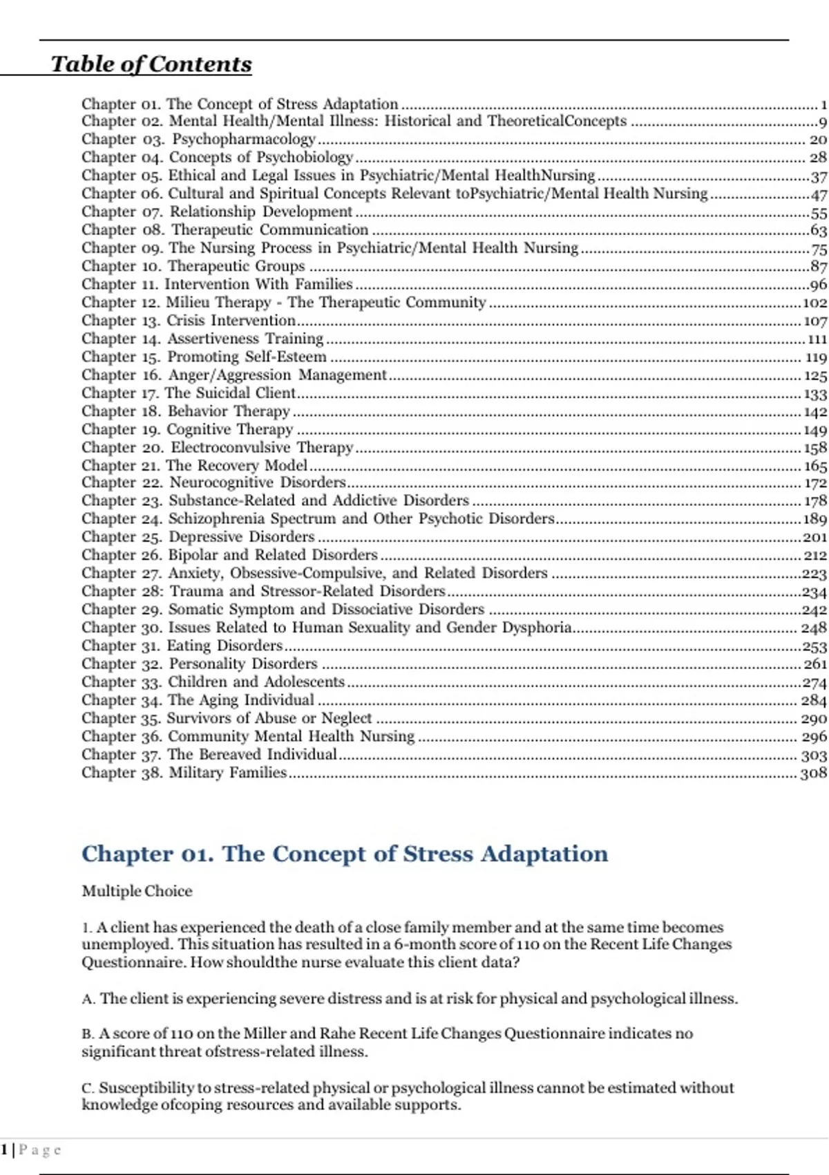 TEST BANK PSYCHIATRIC MENTAL HEALTH NURSING BY MARY TOWNSEND 9TH EDITIONTable of Contents Chapter 01. The Concept of Stress Adaptation .................................................................................................... 1 Chapter 02. Mental Health/Mental Illness: Historical and Theoretical Concepts ............................................. 9 Chapter 03. Psychopharmacology ..................................................................................................................... 20 Chapter 04. Concepts of Psychobiology ............................................................................................................ 28 Chapter 05. Ethical and Legal Issues in Psychiatric/Mental Health Nursing ................................................... 37 Chapter 06. Cultural and Spiritual Concepts Relevant to Psychiatric/Mental Health Nursing ........................ 47 Chapter 07. Relationship Development ............................................................................................................. 55 Chapter 08. Therapeutic Communication ......................................................................................................... 63 Chapter 09. The Nursing Process in Psychiatric/Mental Health Nursing ....................................................... 75 Chapter 10. Therapeutic Groups ........................................................................................................................ 87 Chapter 11. Intervention With Families .............................................................................................................96 Chapter 12. Milieu Therapy - The Therapeutic Community ........................................................................... 102 Chapter 13. Crisis Intervention ......................................................................................................................... 107 Chapter 14. Assertiveness Training ................................................................................................................... 111 Chapter 15. Promoting Self-Esteem ................................................................................................................. 119 Chapter 16. Anger/Aggression Management ................................................................................................... 125 Chapter 17. The Suicidal Client ......................................................................................................................... 133 Chapter 18. Behavior Therapy .......................................................................................................................... 142 Chapter 19. Cognitive Therapy ......................................................................................................................... 149 Chapter 20. Electroconvulsive Therapy ........................................................................................................... 158 Chapter 21. The Recovery Model ...................................................................................................................... 165 Chapter 22. Neurocognitive Disorders ............................................................................................................. 172 Chapter 23. Substance-Related and Addictive Disorders ............................................................................... 178 Chapter 24. Schizophrenia Spectrum and Other Psychotic Disorders ........................................................... 189 Chapter 25. Depressive Disorders .................................................................................................................... 201 Chapter 26. Bipolar and Related Disorders ..................................................................................................... 212 Chapter 27. Anxiety, Obsessive-Compulsive, and Related Disorders ............................................................ 223 Chapter 28: Trauma and Stressor-Related Disorders .....................................................................................234 Chapter 29. Somatic Symptom and Dissociative Disorders ...........................................................................242 Chapter 30. Issues Related to Human Sexuality and Gender Dysphoria ...................................................... 248 Chapter 31. Eating Disorders ............................................................................................................................ 253 Chapter 32. Personality Disorders ................................................................................................................... 261 Chapter 33. Children and Adolescents ............................................................................................................. 274 Chapter 34. The Aging Individual ................................................................................................................... 284 Chapter 35. Survivors of Abuse or Neglect ..................................................................................................... 290 Chapter 36. Community Mental Health Nursing ........................................................................................... 296 Chapter 37. The Bereaved Individual .............................................................................................................. 303 Chapter 38. Military Families .......................................................................................................................... 308 Chapter 01. The Concept of Stress Adaptation Multiple Choice 1. A client has experienced the death of a close family member and at the same time becomes unemployed. This situation has resulted in a 6-month score of 110 on the Recent Life Changes Questionnaire. How should the nurse evaluate this client data? A. The client is experiencing severe distress and is at risk for phy