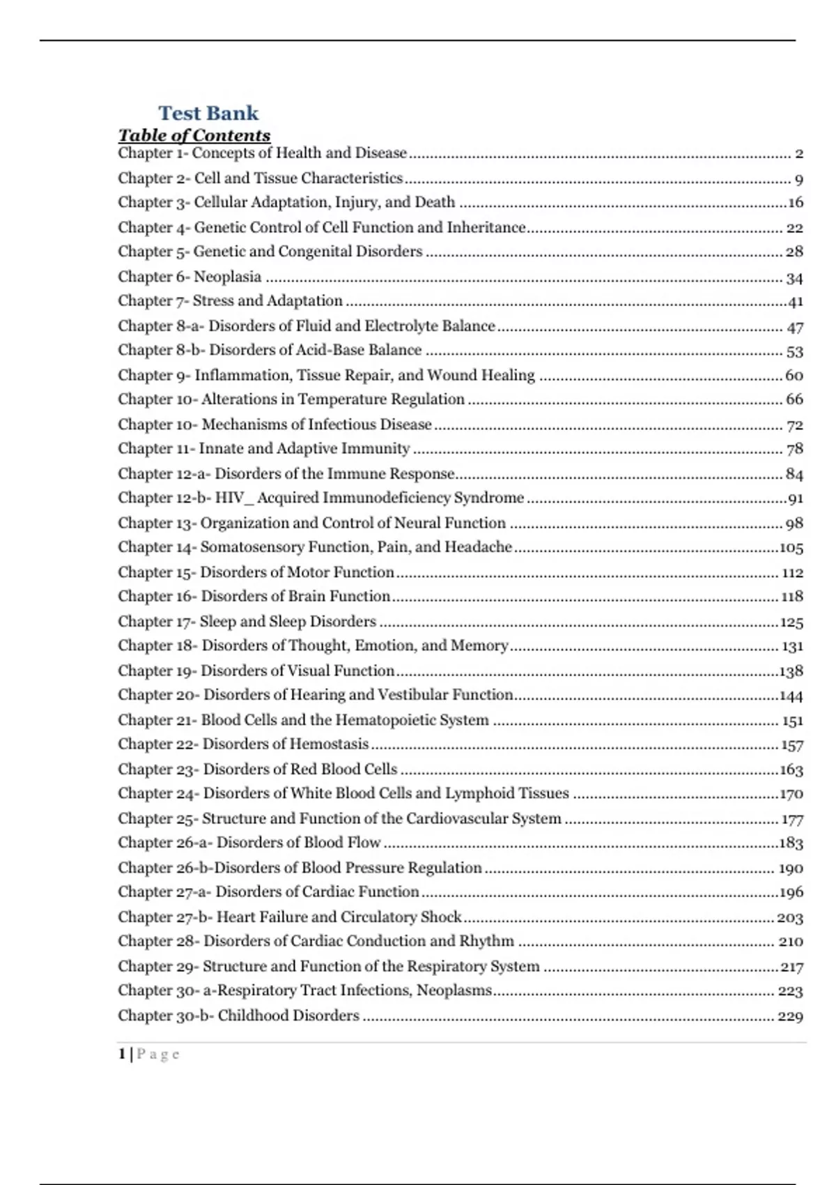 Test Bank Porth's Pathophysiology Concepts of Altered Health 10th Edition NorrisTable of Contents Chapter 1- Concepts of Health and Disease ........................................................................................... 2 Chapter 2- Cell and Tissue Characteristics ............................................................................................ 9 Chapter 3- Cellular Adaptation, Injury, and Death .............................................................................. 16 Chapter 4- Genetic Control of Cell Function and Inheritance ............................................................. 22 Chapter 5- Genetic and Congenital Disorders ..................................................................................... 28 Chapter 6- Neoplasia ........................................................................................................................... 34 Chapter 7- Stress and Adaptation ......................................................................................................... 41 Chapter 8-a- Disorders of Fluid and Electrolyte Balance .................................................................... 47 Chapter 8-b- Disorders of Acid-Base Balance ..................................................................................... 53 Chapter 9- Inflammation, Tissue Repair, and Wound Healing .......................................................... 60 Chapter 10- Alterations in Temperature Regulation ........................................................................... 66 Chapter 10- Mechanisms of Infectious Disease ................................................................................... 72 Chapter 11- Innate and Adaptive Immunity ........................................................................................ 78 Chapter 12-a- Disorders of the Immune Response.............................................................................. 84 Chapter 12-b- HIV_ Acquired Immunodeficiency Syndrome .............................................................. 91 Chapter 13- Organization and Control of Neural Function ................................................................. 98 Chapter 14- Somatosensory Function, Pain, and Headache ............................................................... 105 Chapter 15- Disorders of Motor Function ........................................................................................... 112 Chapter 16- Disorders of Brain Function ............................................................................................ 118 Chapter 17- Sleep and Sleep Disorders ............................................................................................... 125 Chapter 18- Disorders of Thought, Emotion, and Memory ................................................................ 131 Chapter 19- Disorders of Visual Function ........................................................................................... 138 Chapter 20- Disorders of Hearing and Vestibular Function ............................................................... 144 Chapter 21- Blood Cells and the Hematopoietic System .................................................................... 151 Chapter 22- Disorders of Hemostasis ................................................................................................. 157 Chapter 23- Disorders of Red Blood Cells .......................................................................................... 163 Chapter 24- Disorders of White Blood Cells and Lymphoid Tissues ................................................. 170 Chapter 25- Structure and Function of the Cardiovascular System ................................................... 177 Chapter 26-a- Disorders of Blood Flow .............................................................................................. 183 Chapter 26-b-Disorders of Blood Pressure Regulation ..................................................................... 190 Chapter 27-a- Disorders of Cardiac Function ..................................................................................... 196 Chapter 27-b- Heart Failure and Circulatory Shock .......................................................................... 203 Chapter 28- Disorders of Cardiac Conduction and Rhythm ............................................................. 210 Chapter 29- Structure and Function of the Respiratory System ........................................................ 217 Chapter 30- a-Respiratory Tract Infections, Neoplasms ................................................................... 223 Chapter 30-b- Childhood Disorders .................................................................................................. 229 1 | P a g eChapter 31- Disorders of Ventilation and Gas Exchange ................................................................... 236 Chapter 32- Structure and Function of the Kidney ........................................................................... 242 Chapter 33- Disorders of Renal Function .......................................................................................... 248 Chapter 34- Acute Renal Injury and Chronic Kidney Disease ........................................................... 255 Chapter 35- Disorders of the Bladder and Lower Urinary Tract ........................................................ 261 Chapter 36- Structure and Function of the Gastrointestinal System ................................................ 268 Chapter 37- Disorders of Gastrointestinal Function ...........................................................................275 Chapter 38- Disorders of Hepatobiliary and Exocrine Pancreas Function ....................................... 282 Chapter 39- Alterations in Nutritional Status .................................................................................... 289 Chapter 40- Mechanisms of Endocrine Control ........................
