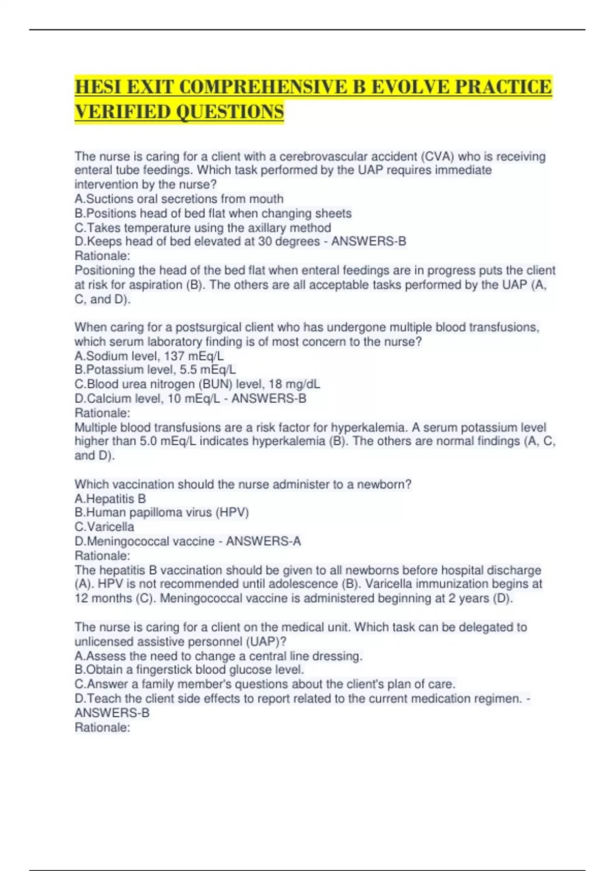 HESI EXIT COMPREHENSIVE B EVOLVE PRACTICE VERIFIED QUESTIONS The nurse is caring for a client with a cerebrovascular accident (CVA) who is receiving enteral tube feedings. Which task performed by the UAP requires immediate intervention by the nurse? A.Suctions oral secretions from mouth B.Positions head of bed flat when changing sheets C.Takes temperature using the axillary method D.Keeps head of bed elevated at 30 degrees - ANSWERS-B Rationale: Positioning the head of the bed flat when enteral feedings are in progress puts the client at risk for aspiration (B). The others are all acceptable tasks performed by the UAP (A, C, and D). When caring for a postsurgical client who has undergone multiple blood transfusions, which serum laboratory finding is of most concern to the nurse? A.Sodium level, 137 mEq/L B.Potassium level, 5.5 mEq/L C.Blood urea nitrogen (BUN) level, 18 mg/dL D.Calcium level, 10 mEq/L - ANSWERS-B Rationale: Multiple blood transfusions are a risk factor for hyperkalemia. A serum potassium level higher than 5.0 mEq/L indicates hyperkalemia (B). The others are normal findings (A, C, and D). Which vaccination should the nurse administer to a newborn? A.Hepatitis B B.Human papilloma virus (HPV) C.Varicella D.Meningococcal vaccine - ANSWERS-A Rationale: The hepatitis B vaccination should be given to all newborns before hospital discharge (A). HPV is not recommended until adolescence (B). Varicella immunization begins at 12 months (C). Meningococcal vaccine is administered beginning at 2 years (D). The nurse is caring for a client on the medical unit. Which task can be delegated to unlicensed assistive personnel (UAP)? A.Assess the need to change a central line dressing. B.Obtain a fingerstick blood glucose level. C.Answer a family member's questions about the client's plan of care. D.Teach the client side effects to report related to the current medication regimen. - ANSWERS-B Rationale: Obtaining a fingerstick blood glucose level is a simple treatment and is an appropriate skill for UAP to perform (B). (A, C, and D) are skills that cannot be delegated to UAP. The nurse is caring for a client with an ischemic stroke who has a prescription for tissue plasminogen activator (t-PA) IV. Which action(s) should the nurse expect to implement? (Select all that apply.) A.Administer aspirin with tissue plasminogen activator (t-PA). B.Complete the National Institute of Health Stroke Scale (NIHSS). C.Assess the client for signs of bleeding during and after the infusion. D.Start t-PA within 6 hours after the onset of stroke symptoms. E.Initiate multidisciplinary consult for potential rehabilitation. - ANSWERS-B,C,E Rationale: Neurologic assessment, including the NIHSS, is indicated for the client receiving t-PA. This includes close monitoring for bleeding during and after the infusion; if bleeding or other signs of neurologic impairment occur, the infusion should be stopped (B, C, and E). Aspirin is contraindicated with t-PA because it increases the risk for bleeding (A). The administration of t-PA within 6 hours of symptoms is concurrent with a diagnosis of a myocardial infarction and within 4.5 hours of symptoms is concurrent for a stroke (D). When caring for a client in labor, which finding is most important to report to the primary health care provider? A.Maternal heart rate, 90 beats/min. B.Fetal heart rate, 100 beats/min C.Maternal blood pressure, 140/86 mm Hg D.Maternal temperature, 100.0° F - ANSWERS-B Rationale: A fetal heart rate (FHR) of 100 beats/min may indicate fetal distress (B) because the average FHR at term is 140 beats/min and the normal range is 110 to beats/min 160. The others (A, C, and D) are normal findings for a woman in labor. The nurse is caring for a client with heart failure who develops respiratory distress and coughs up pink frothy sputum. Which action should the nurse take first? A.Draw arterial blood gases. B.Notify the primary health care provider. C.Position in a high Fowler's position with the legs down. D.Obtain a chest X-ray. - ANSWERS-C Rationale: Positioning the patient in a high Fowler's position with dangling feet will decrease further venous return to the left ventricle (C). The other actions should be performed after the change in position (A, B, and D)