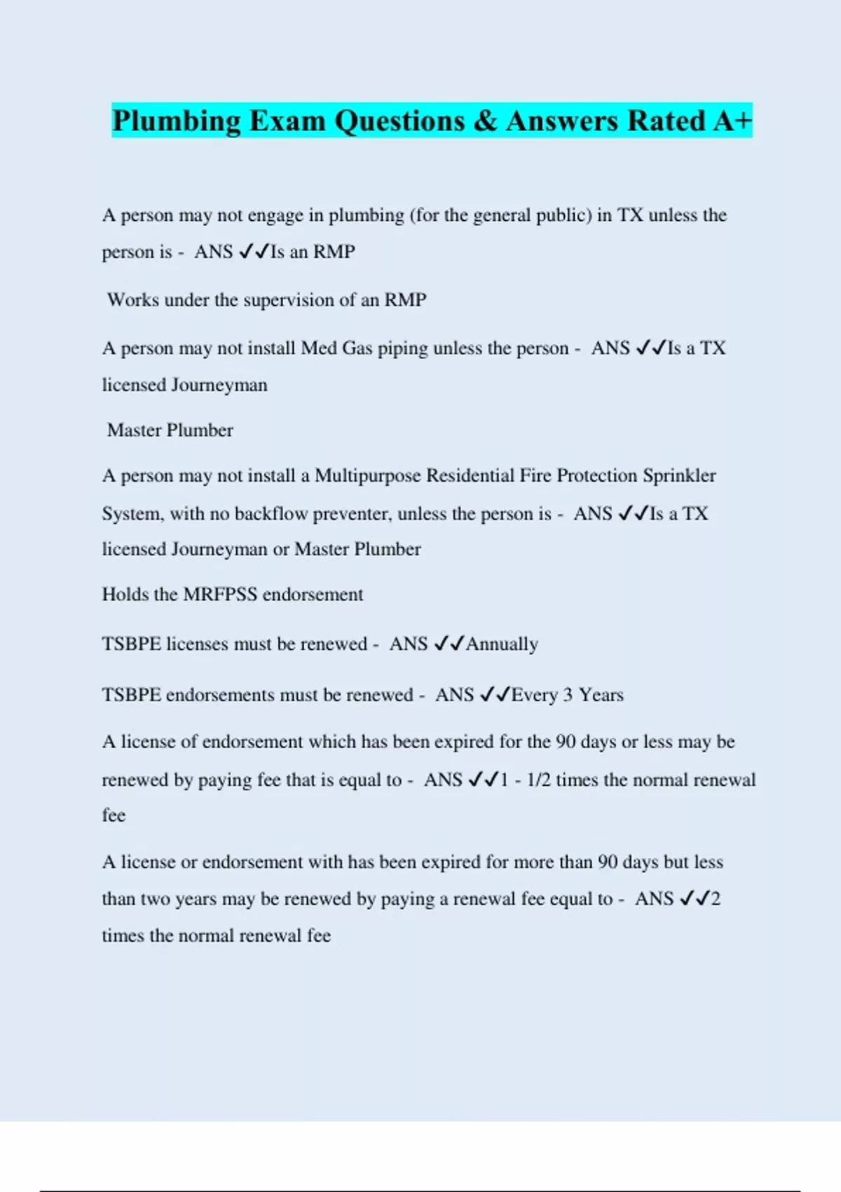 Plumbing Exam Questions & Answers Rated A+ A person may not engage in plumbing (for the general public) in TX unless the person is - ANS ️️ Is an RMP Works under the supervision of an RMP A person may not install Med Gas piping unless the person - ANS ️️ Is a TX licensed Journeyman Master Plumber A person may not install a Multipurpose Residential Fire Protection Sprinkler System, with no backflow preventer, unless the person is - ANS ️️ Is a TX licensed Journeyman or Master Plumber Holds the MRFPSS endorsement TSBPE licenses must be renewed - ANS ️️ Annually TSBPE endorsements must be renewed - ANS ️️ Every 3 Years A license of endorsement which has been expired for the 90 days or less may be renewed by paying fee that is equal to - ANS ️️ 1 - 1/2 times the normal renewal fee A license or endorsement with has been expired for more than 90 days but less than two years may be renewed by paying a renewal fee equal to - ANS ️️ 2 times the normal renewal fee