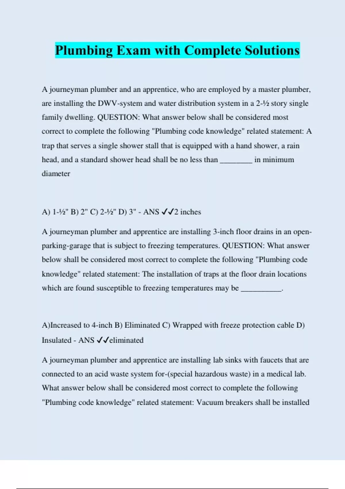 Plumbing Exam with Complete Solutions A journeyman plumber and an apprentice, who are employed by a master plumber, are installing the DWV-system and water distribution system in a 2-½ story single family dwelling. QUESTION: What answer below shall be considered most correct to complete the following "Plumbing code knowledge" related statement: A trap that serves a single shower stall that is equipped with a hand shower, a rain head, and a standard shower head shall be no less than ________ in minimum diameter A) 1-½" B) 2" C) 2-½" D) 3" - ANS ️️ 2 inches A journeyman plumber and apprentice are installing 3-inch floor drains in an open- parking-garage that is subject to freezing temperatures. QUESTION: What answer below shall be considered most correct to complete the following "Plumbing code knowledge" related statement: The installation of traps at the floor drain locations which are found susceptible to freezing temperatures may be __________. A)Increased to 4-inch B) Eliminated C) Wrapped with freeze protection cable D) Insulated - ANS ️️ eliminated A journeyman plumber and apprentice are installing lab sinks with faucets that are connected to an acid waste system for-(special hazardous waste) in a medical lab. What answer below shall be considered most correct to complete the following "Plumbing code knowledge" related statement: Vacuum breakers shall be installed with the critical level at least _____-inches above the flood level rim of the fixture they serve and on the discharge side of the last control valve to the fixture. A) 12 B) 6 C) 18 D) 3 - ANS ️️ 6 inches What answer below shall be considered most correct to complete the following "Plumbing code knowledge" related statement: No plumbing permit shall be issued for cross connection installations that require ______________ until the application for a permit is accompanied by a letter of approval from the Massachusetts Department of Environmental Protection or its designee. A) RPBP B) A "critical level" height C) Atmospheric vacuum breakers D) Water recycling systems - ANS ️️ reduced pressure backflow preventer (RPBP) : What answer below shall be considered most correct to complete the following "Plumbing code knowledge" related statement: The waste discharge from safe waste pans serving water heaters or hot water storage tanks where there is _______ below and shall be piped indirectly to a properly trapped and vented fixture. A) People B) Occupancy C) Floors D) Plumbing connections - ANS ️️ occupancy GIVEN: A journeyman plumber and an apprentice, (who are employed by a master plumber), are installing the sanit