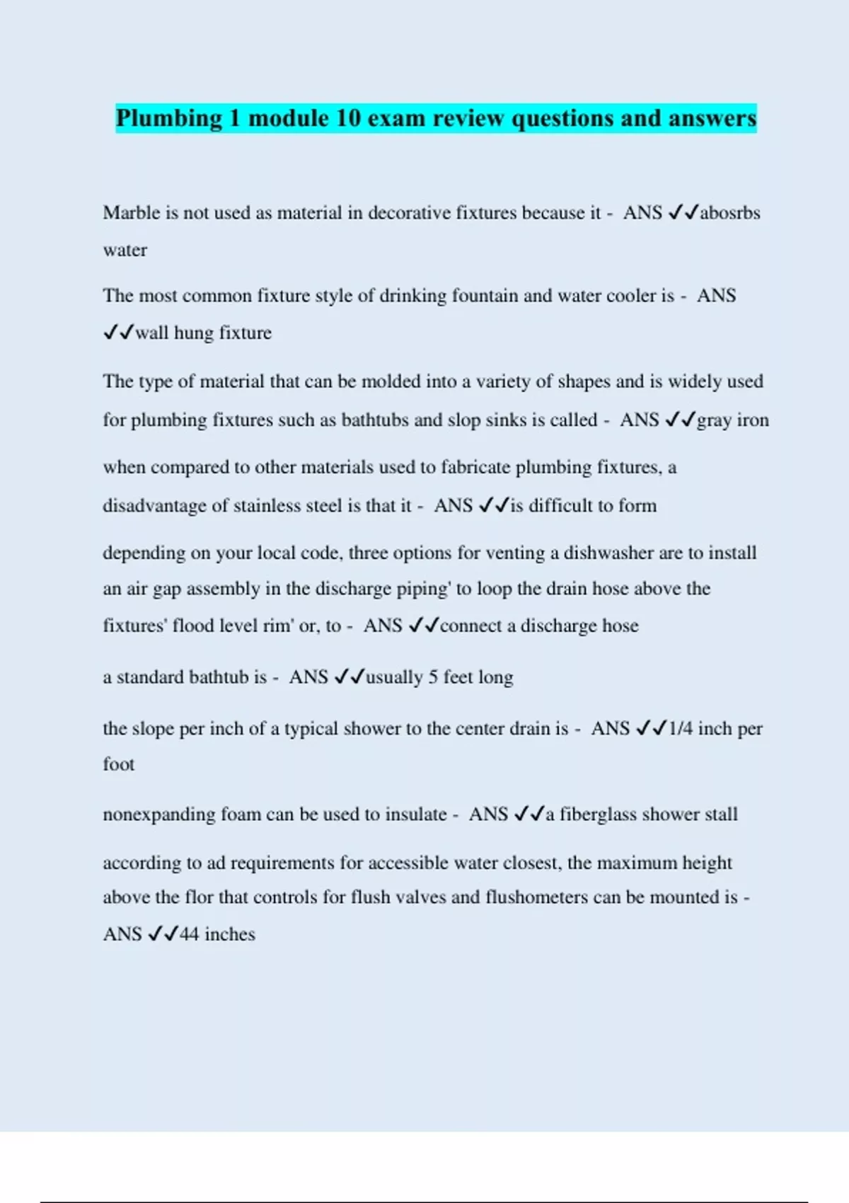 Plumbing 1 module 10 exam review questions and answers Marble is not used as material in decorative fixtures because it - ANS ️️ abosrbs water The most common fixture style of drinking fountain and water cooler is - ANS ️️ wall hung fixture The type of material that can be molded into a variety of shapes and is widely used for plumbing fixtures such as bathtubs and slop sinks is called - ANS ️️ gray iron when compared to other materials used to fabricate plumbing fixtures, a disadvantage of stainless steel is that it - ANS ️️ is difficult to form depending on your local code, three options for venting a dishwasher are to install an air gap assembly in the discharge piping' to loop the drain hose above the fixtures' flood level rim' or, to - ANS ️️ connect a discharge hose a standard bathtub is - ANS ️️ usually 5 feet long the slope per inch of a typical shower to the center drain is - ANS ️️ 1/4 inch per foot nonexpanding foam can be used to insulate - ANS ️️ a fiberglass shower stall according to ad requirements for accessible water closest, the maximum height above the flor that controls for flush valves and flushometers can be mounted is - ANS ️️ 44 inches