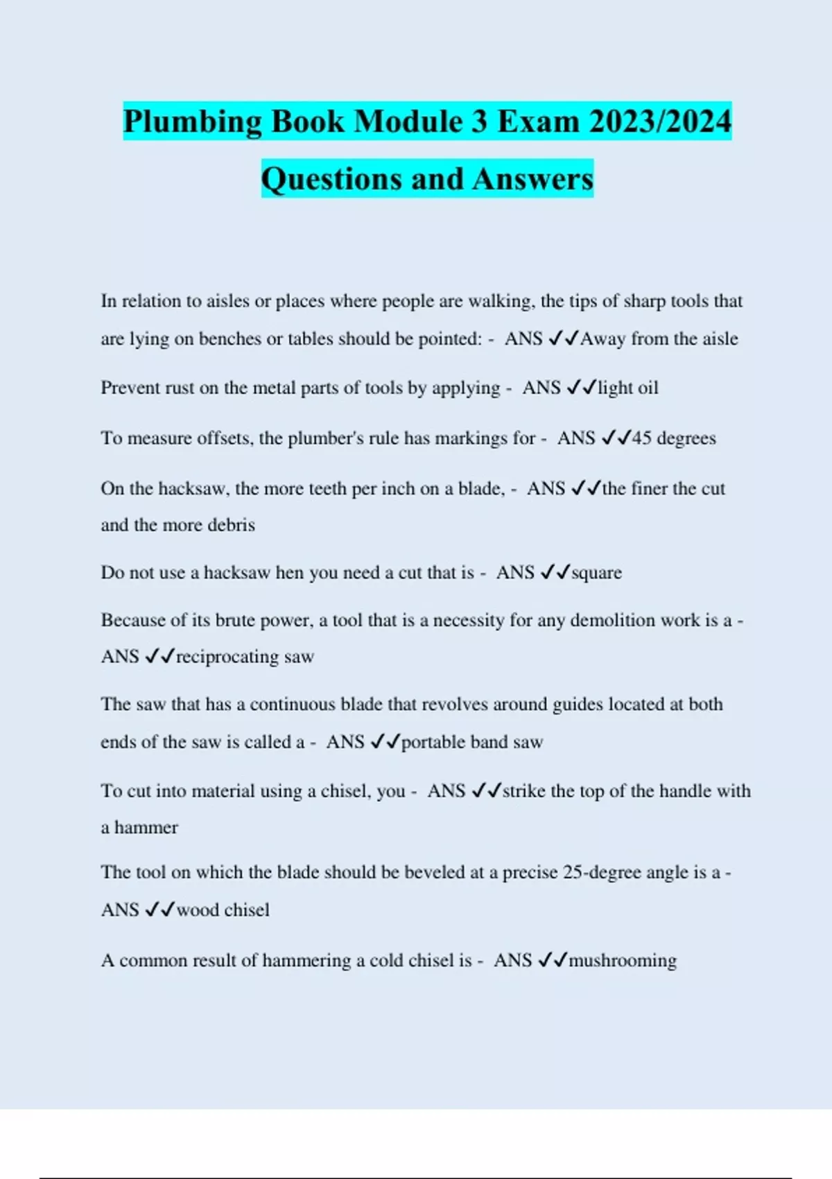 Plumbing Book Module 3 Exam 2023/2024 Questions and Answers In relation to aisles or places where people are walking, the tips of sharp tools that are lying on benches or tables should be pointed: - ANS ️️ Away from the aisle Prevent rust on the metal parts of tools by applying - ANS ️️ light oil To measure offsets, the plumber's rule has markings for - ANS ️️ 45 degrees On the hacksaw, the more teeth per inch on a blade, - ANS ️️ the finer the cut and the more debris Do not use a hacksaw hen you need a cut that is - ANS ️️ square Because of its brute power, a tool that is a necessity for any demolition work is a - ANS ️️ reciprocating saw The saw that has a continuous blade that revolves around guides located at both ends of the saw is called a - ANS ️️ portable band saw To cut into material using a chisel, you - ANS ️️ strike the top of the handle with a hammer The tool on which the blade should be beveled at a precise 25-degree angle is a - ANS ️️ wood chisel A common result of hammering a cold chisel is - ANS ️️ mushrooming