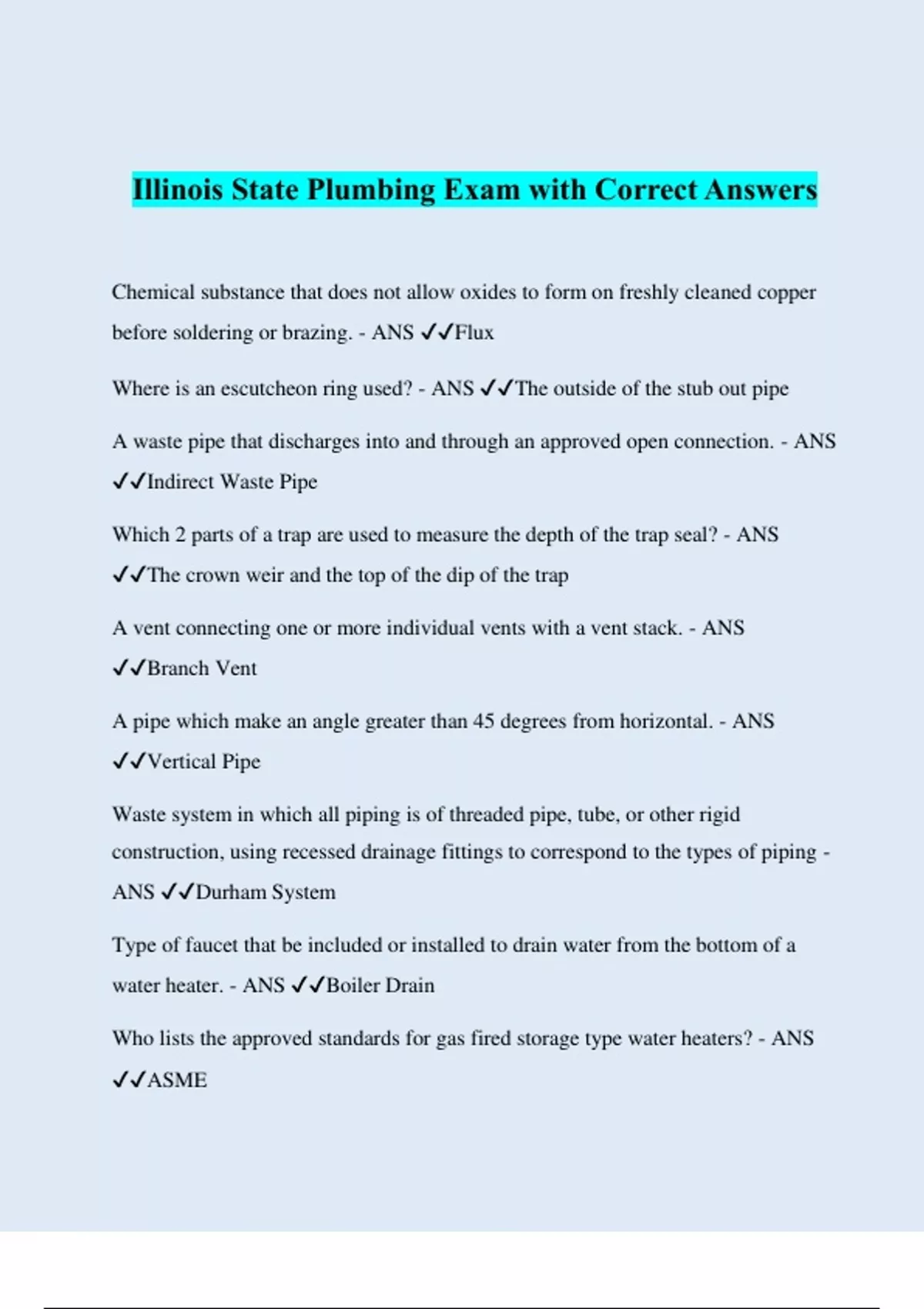 Illinois State Plumbing Exam with Correct Answers Chemical substance that does not allow oxides to form on freshly cleaned copper before soldering or brazing. - ANS ️️ Flux Where is an escutcheon ring used? - ANS ️️ The outside of the stub out pipe A waste pipe that discharges into and through an approved open connection. - ANS ️️ Indirect Waste Pipe Which 2 parts of a trap are used to measure the depth of the trap seal? - ANS ️️ The crown weir and the top of the dip of the trap A vent connecting one or more individual vents with a vent stack. - ANS ️️ Branch Vent A pipe which make an angle greater than 45 degrees from horizontal. - ANS ️️ Vertical Pipe Waste system in which all piping is of threaded pipe, tube, or other rigid construction, using recessed drainage fittings to correspond to the types of piping - ANS ️️ Durham System Type of faucet that be included or installed to drain water from the bottom of a water heater. - ANS ️️ Boiler Drain Who lists the approved standards for gas fired storage type water heaters? - ANS ️️ ASME