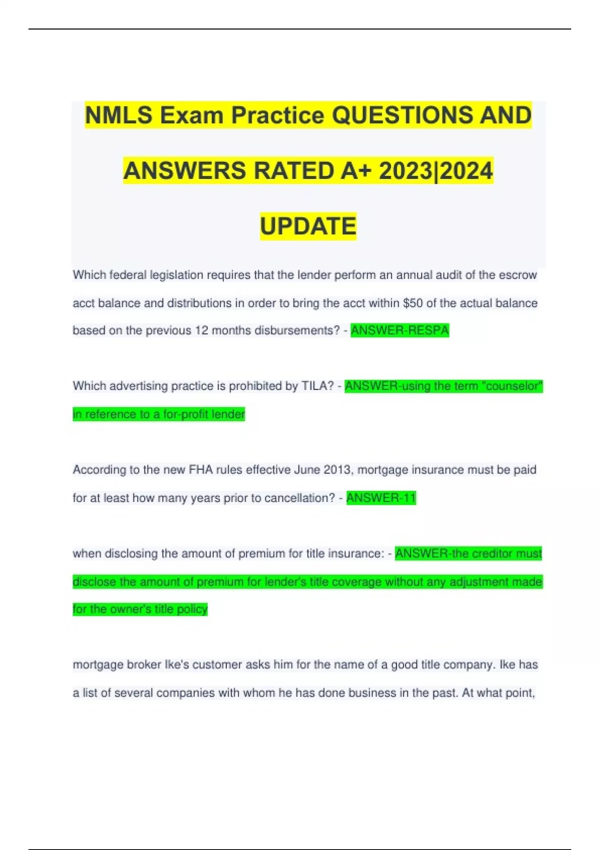Which federal legislation requires that the lender perform an annual audit of the escrow acct balance and distributions in order to bring the acct within $50 of the actual balance based on the previous 12 months disbursements? - ANSWER-RESPA Which advertising practice is prohibited by TILA? - ANSWER-using the term "counselor" in reference to a for-profit lender According to the new FHA rules effective June 2013, mortgage insurance must be paid for at least how many years prior to cancellation? - ANSWER-11 when disclosing the amount of premium for title insurance: - ANSWER-the creditor must disclose the amount of premium for lender's title coverage without any adjustment made for the owner's title policy