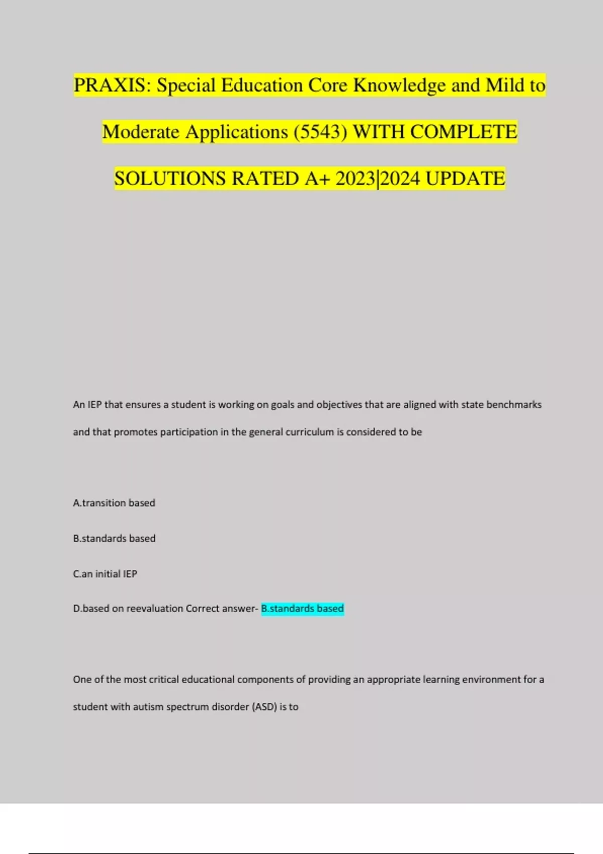 PRAXIS: Special Education Core Knowledge and Mild to Moderate Applications (5543) WITH COMPLETE SOLUTIONS RATED A+ 2023|2024 UPDATE