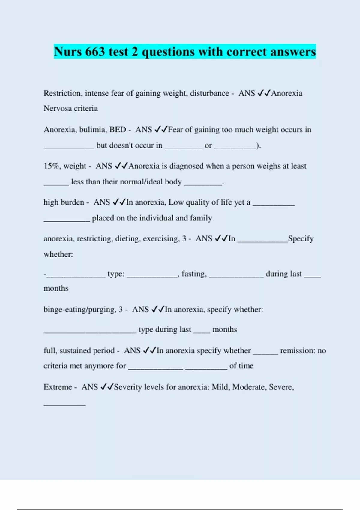 Nurs 663 test 2 questions with correct answers Restriction, intense fear of gaining weight, disturbance - ANS ️️ Anorexia Nervosa criteria Anorexia, bulimia, BED - ANS ️️ Fear of gaining too much weight occurs in ____________ but doesn't occur in _________ or __________). 15%, weight - ANS ️️ Anorexia is diagnosed when a person weighs at least ______ less than their normal/ideal body _________. high burden - ANS ️️ In anorexia, Low quality of life yet a __________ ___________ placed on the individual and family anorexia, restricting, dieting, exercising, 3 - ANS ️️ In ____________Specify whether: -______________ type: ____________, fasting, _____________ during last ____ months binge-eating/purging, 3 - ANS ️️ In anorexia, specify whether: ______________________ type during last ____ months full, sustained period - ANS ️️ In anorexia specify whether ______ remission: no criteria met anymore for _____________ __________ of time Extreme - ANS ️️ Severity levels for anorexia: Mild, Moderate, Severe, __________