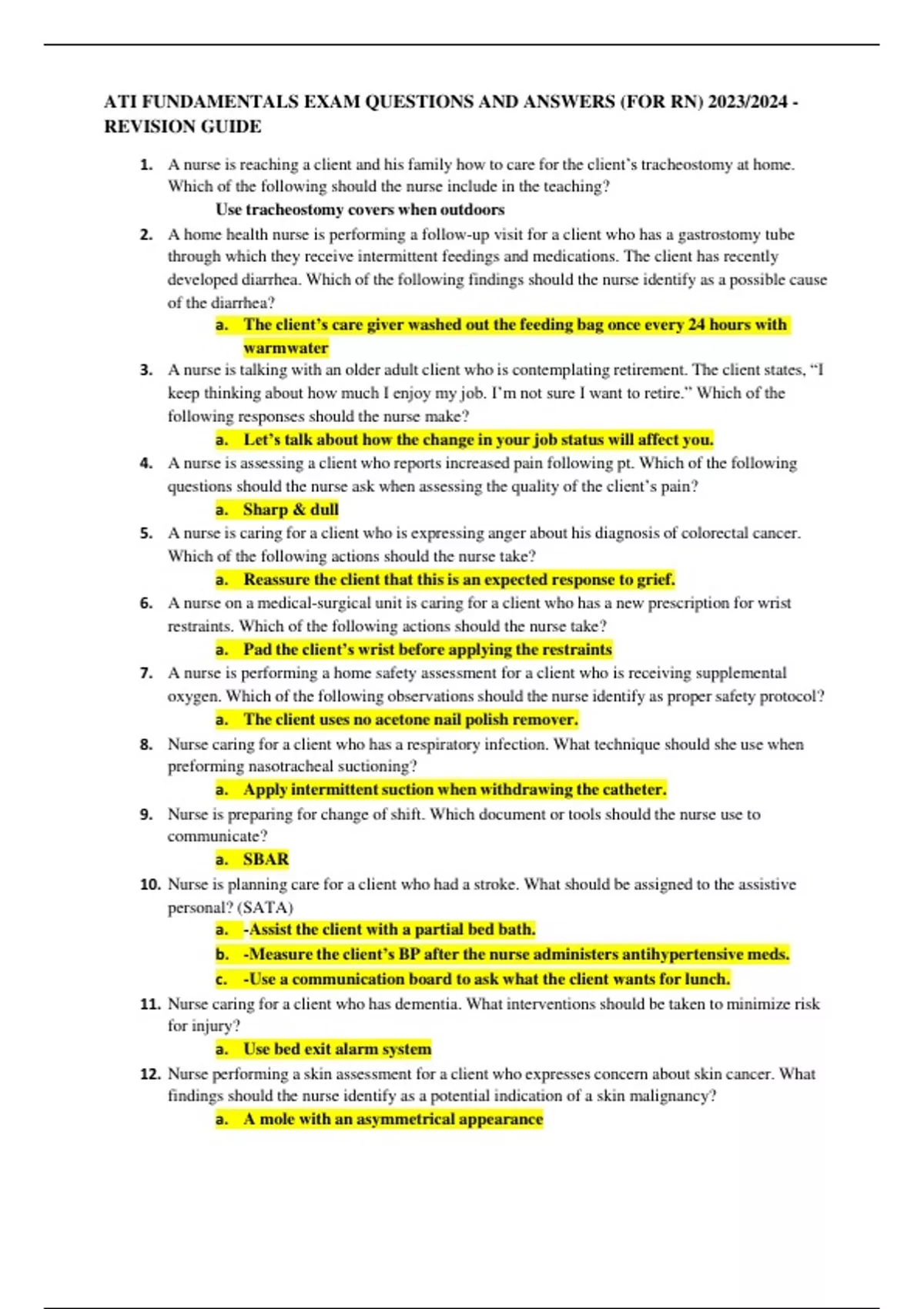 ATI FUNDAMENTALS EXAM QUESTIONS AND ANSWERS (FOR RN) 2024 - REVISION GUIDE