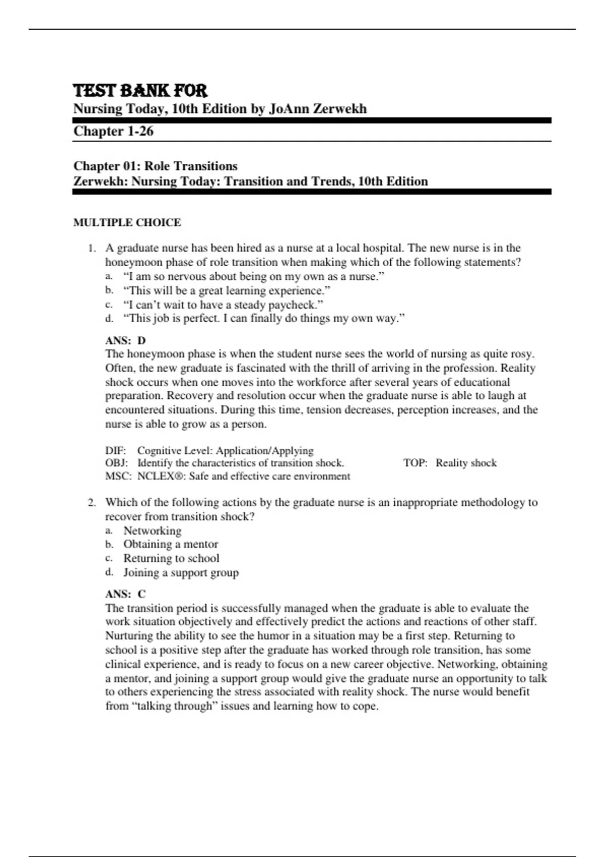 Test Bank for Nursing Today Transition and Trends 10th Edition by JoAnn Zerwekh, Ashley Garneau Nursing Today: Transition and Trends 10th Edition by JoAnn Zerwekh EdD RN (Author), Ashley Garneau