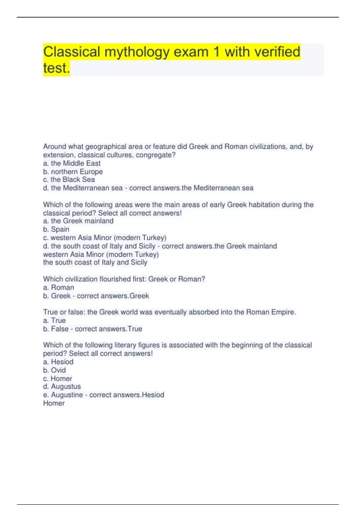 Classical mythology exam 1 with verified test. Around what geographical area or feature did Greek and Roman civilizations, and, by extension, classical cultures, congregate? a. the Middle East b. northern Europe c. the Black Sea d. the Mediterranean sea - correct Mediterranean sea Which of the following areas were the main areas of early Greek habitation during the classical period? Select all correct answers! a. the Greek mainland b. Spain c. western Asia Minor (modern Turkey) d. the south coast of Italy and Sicily - correct Greek mainland western Asia Minor (modern Turkey) the south coast of Italy and Sicily Which civilization flourished first: Greek or Roman? a. Roman b. Greek - correct answers.Greek True or false: the Greek world was eventually absorbed into the Roman Empire. a. True b. False - correct answers.True Which of the following literary figures is associated with the beginning of the classical period? Select all correct answers! a. Hesiod b. Ovid c. Homer d. Augustus e. Augustine - correct answers.Hesiod Homer What events or processes are frequently associated with the emergence of classical civilization in the Greco-Roman world? Select all correct answers! a. the sack of Rome b. the beginnings of literacy and the invention of the Greek alphabet c. the reign of Augustus d. the first Olympiad and the emergence of a panhellenic or "all-Greek" identity e. the emergence of the polis or "city-state" - correct beginnings of literacy and the invention of the Greek alphabet the first Olympiad and the emergence of a panhellenic or "all-Greek" identity the emergence of the polis or "city-state" In addition to being a major thinker in the early Christian tradition, why is Augustine of Hippo sometimes associated with the end of classical antiquity? a. he was a leader of invaders who successfully attacked the Roman Empire b. he was alive during the Sack of Rome in 410 CE c. he was the last emperor of Rome d. he was also the first Roman Christian - correct was alive during the Sack of Rome in 410 CE Under what form of political governance did Rome initially expand as an empire? a. democracy b. a Republican system of elected magistrates c. the Principate, the constitutional form instituted by the emperor Augustus d. a monarchy, led by kings - correct answers.a Republican system of elected magistrates True or false: Rome's success as an empire also brought entrenched political difficulties that ultimately led to disorder and violence. a. True b. False - correct answers.True Who was Augustus' adoptive father? a. Lepidus b. Mark Antony c. Pompey the Great d. Julius Caesar - correct answers.Julius Caesar Who did Augustus defeat to become the supreme ruler of the Roman world? a. Pompey the Great b. Julius Caesar c. Mark Antony & Cleopatra - correct answers.Mark Antony & Cleopatra Which of the following were aspects of Augustus' political program? Select all correct! a. public works and city beautification b. religious and moral reform c. an invasion of Britain d. cultural and artistic patronage e. a program to end taxation f. the banning of "pagan" religions - correct c works and city beautification religious and moral reform cultural and artistic patronage True or false: all Romans were satisfied with Augustus' settlement of the Roman world. a. True b. False - correct answers.False What was the subject of much of Ovid's early poetry? a. rural life b. the deeds of gods and heroes c. history d. love and sex - correct and sex Ovid claimed that he was banished from Rome for a "song and a mistake". What was the song? a. the Art of Love b. the Fasti c. the Metamorphoses d. the Amores e. the Tristia - correct Art of Love What was the mistake? a. Ovid had been concealing his true wealth for years to avoid paying taxes. b. Ovid was trading arms illegally with enemies of Rome. c. We don't really know. d. Ovid was involved in a plot to overthrow Augustus. - correct answers.We don't really know. Which of the following best summarizes what Ovid takes to be the central theme of the Metamorphoses? a. changes b. the gods c. Augustus d. the glory of Rome - correct es Who does Ovid ask to inspire his poetic undertaking? a. Augustus b. his lover c. the gods d. all men who have ever had love affairs - correct gods How does Ovid characterize the cosmos in the beginning? a. he says there was nothing, only void