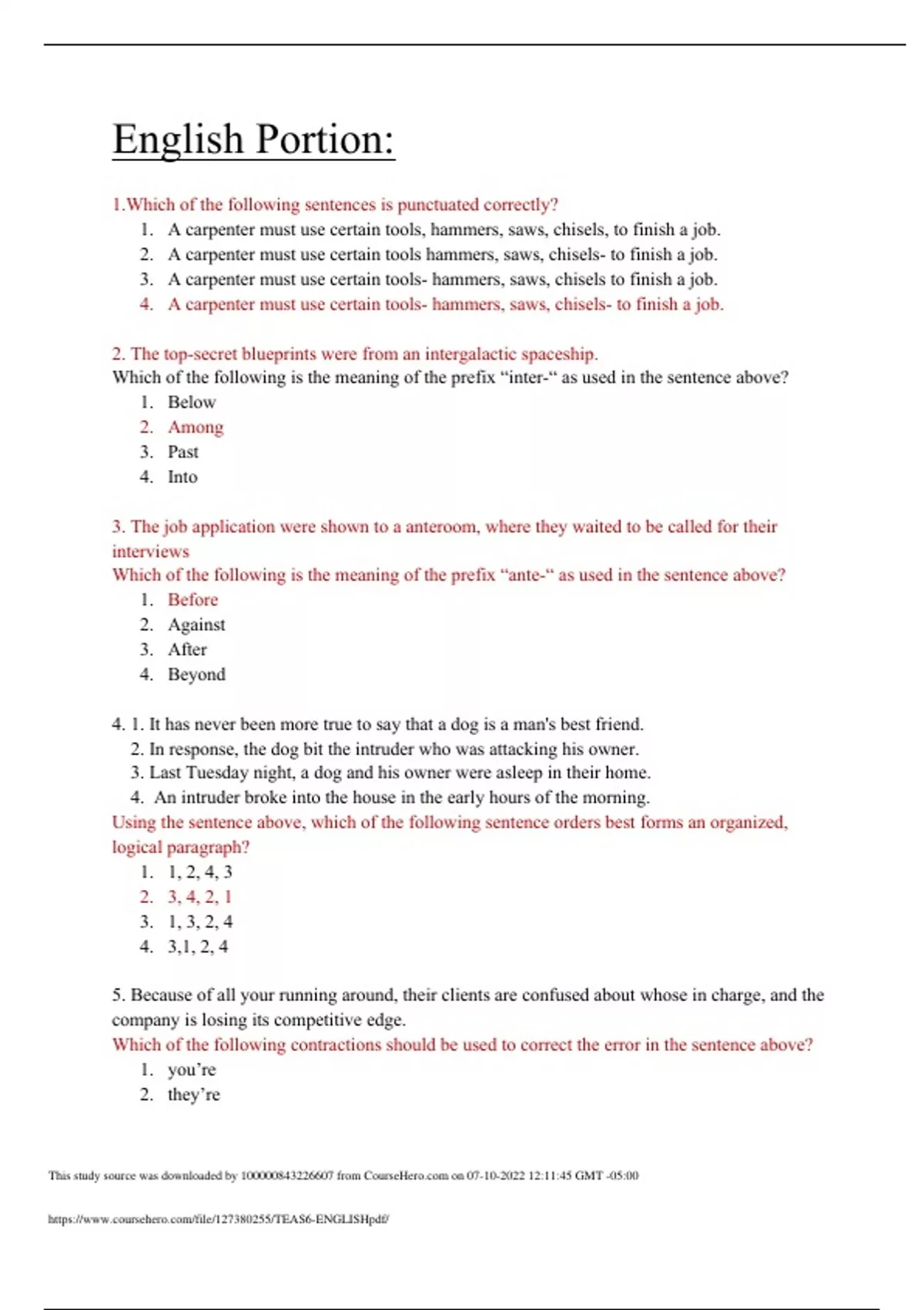 English Portion: 1.Which of the following sentences is punctuated correctly? 1. A carpenter must use certain tools, hammers, saws, chisels, to finish a job. 2. A carpenter must use certain tools hammers, saws, chisels- to finish a job. 3. A carpenter must use certain tools- hammers, saws, chisels to finish a job. 4. A carpenter must use certain tools- hammers, saws, chisels- to finish a job. 2. The top-secret blueprints were from an intergalactic spaceship. Which of the following is the meaning of the prefix “inter-“ as used in the sentence above? 1. Below 2. Among 3. Past 4. Into 3. The job application were shown to a anteroom, where they waited to be called for their interviews Which of the following is the meaning of the prefix “ante-“ as used in the sentence above? 1. Before 2. Against 3. After 4. Beyond 4. 1. It has never been more true to say that a dog is a man's best friend. 2. In response, the dog bit the intruder who was attacking his owner. 3. Last Tuesday night, a dog and his owner were asleep in their home. 4. An intruder broke into the house in the early hours of the morning. Using the sentence above, which of the following sentence orders best forms an organized, logical paragraph? 1. 1, 2, 4, 3 2. 3, 4, 2, 1 3. 1, 3, 2, 4 4. 3,1, 2, 4 5. Because of all your running around, their clients are confused about whose in charge, and the company is losing its competitive edge. Which of the following contractions should be used to correct the error in the sentence above? 1. you’re 2. they’re This study source was downloaded by from CourseH on :11:45 GMT -05:00 3. who’s 4. it’s 6. Which of the following words is spell correctly? 1. Vien 2. Hieght 3. Receive 4. Foriegn 7. In the race for student body government, both students were coequal. Their speeches each pointed to their records to service and academic excellence. Which of the following options is the meaning of “coequal” as used in the sentence above? 1. The students gave speeches that were the same length 2. The students shared the same opinion on the issues. 3. The students were running for the same office. 4. The students had similar accomplishments. 8. I had to wrack my brain and plum the depth of my resources to overcome the foul consequences of my previous vice. Which of the following homophones should be used to correct the sentence above? 1. Rack 2. Plumb 3. Fowl 4. Vise 9. Which of the following sentences would most likely be found in an email from professor to her biology students at a college? 1. Traffic on Highway 32 will be rerouted to Main Street during renovation of the 7th Street Bridge. 2. Research groups from the 10:30 a.m. Tuesday class should meet in the library this week. 3. We want to go out for dinner, but we haven’t decided where to eat yet. 4. I didn’t get any constructive feedback on my paper during the peer review last week. 10. The gist of the saying went something like this: If a person want to get ahead in life, you have to be willing to work for it. Which of the following language conventions is violated in the sentence above? 1. Use of a colon 2. Verb tense 3. Pronoun-antecedent agreement 4. Punctuation of an introductory clause This study source was downloaded by from CourseH on :11:45 GMT -05:00 11. Which of the following sentences demonstrates proper subject-verb agreement? 1. Physics is a difficult subject to learn 2. Measles usually spread through respiratory fluids. 3. The study of various sciences are compelling. 4. News travel fast. 12. Success on the job entails a number of skills; it encompasses string analytical, communication, and organization skills. Which of the following is a synonym for “ entails” as used in the sentence above? 1. Accommodates 2. Interjects 3. Solicits 4. Necessitates 13. Which of the following actions takes place during the revision phase of the writing process? 1. Gathering information 2. Creating ideas 3. Connecting concepts 4. Proofreading text 14. Which of the following is an example of accidental plagiarism? 1. Copying information from a source and identifying it as your own 2. Summarizing information without including a source credit 3. Forgetting to include an in-text citation for information 4. Submitting a paper that was written by a friend 15. Which of the following is an example of second-person narrative voice? 1. She won first place at the county fair with my homemade blueberry pie recipe. 2. We are planning a trip to Florida for our vacation in January. 3. You go to the window because someone is knocking insistently on the floor door . 4. I wanted to visit the art museum to see the new sculpture exhibit. 16. John followed the doctor’s ______________ to get more rest. Which of the following options correctly completes the sentence above? 1. reccomendation 2. recommendation 3. recomendation 4. reccommendation This study source was downloaded by from CourseH on :11:45 GMT -05:00 17. The triplets could sing very well, so they and a friend formed a __________ for the annual talent show. Which of the following options correctly completes the sentence above? 1. quartet 2. quintet 3. octet 4. duet 18. Which of the following options is the correct spelling of the plural form of “crisis”? 1. Crisises 2. Crisis’s 3. Crises 4. Crises’s 19. As a true bibliophile, she spent a great deal of time in the library. Which of the following defines the word “bibliophile” as used in the sentence above? 1. A university professor 2. A collector of rare maps 3. A research scientist 4. A lover of books 20. Having been discovered, River looked up at his owner with puppy- dog eyes. Which of the following groups of words is misplaced the sentence above? 1. with puppy-dog eyes 2. been discovered 3. his owner 4. Rover looked up 21. The very lively lady was riding a beautiful parade float. Which of the following parts of speech is the word “lively” in the sentence above? 1. Adverb 2. Adjective 3. Interjection 4. Conjunction 22. Which o