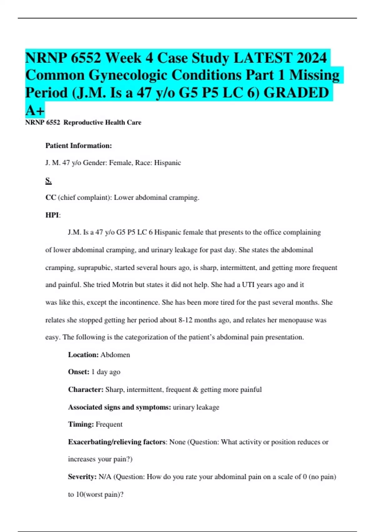 NRNP 6552 Week 4 Case Study LATEST 2024 Common Gynecologic Conditions Part 1 Missing Period (J.M. Is a 47 y/o G5 P5 LC 6) GRADED A+