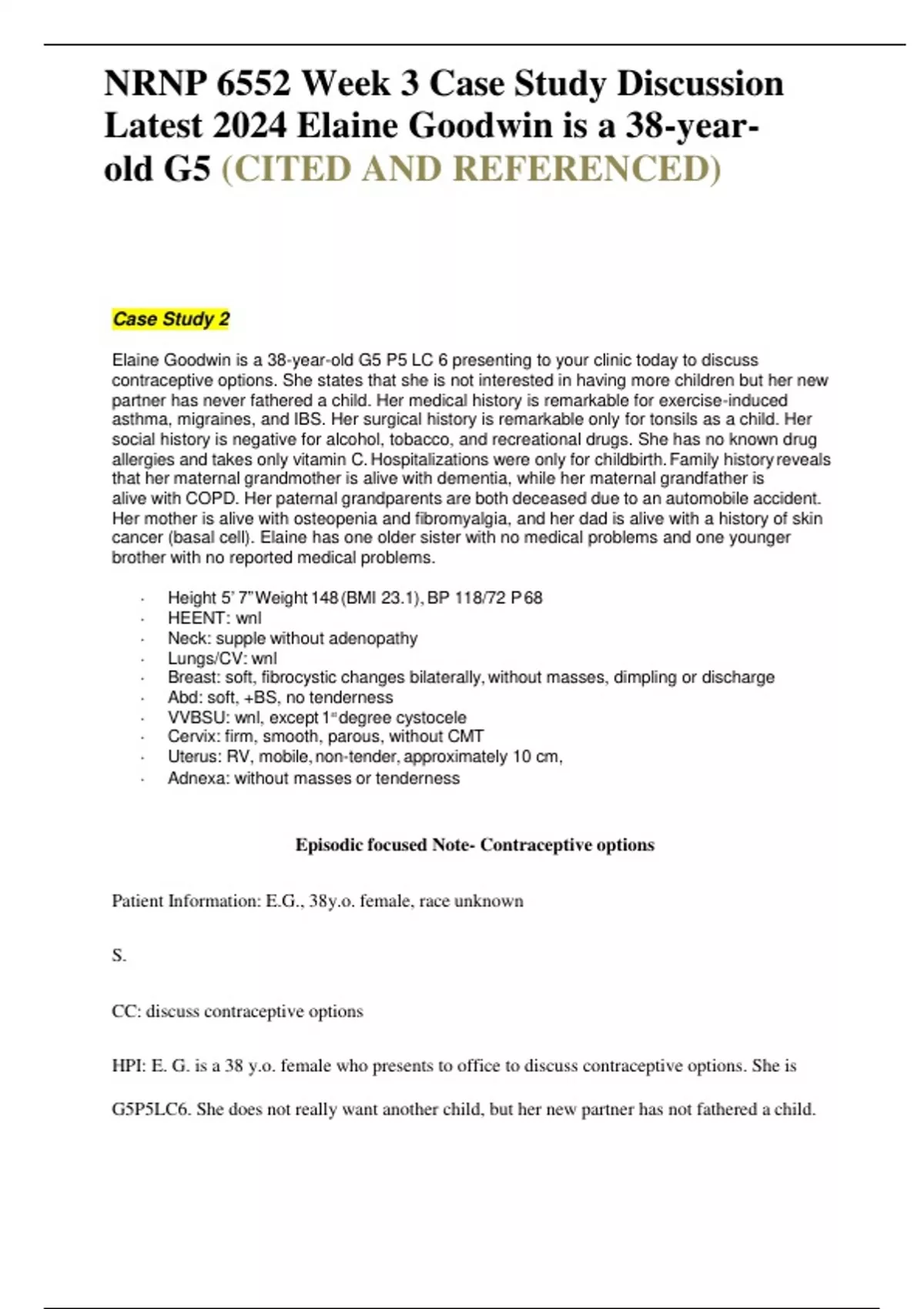NRNP 6552 Week 3 Case Study Discussion Latest 2024 Elaine Goodwin is a 38-year-old G5 (CITED AND REFERENCED)