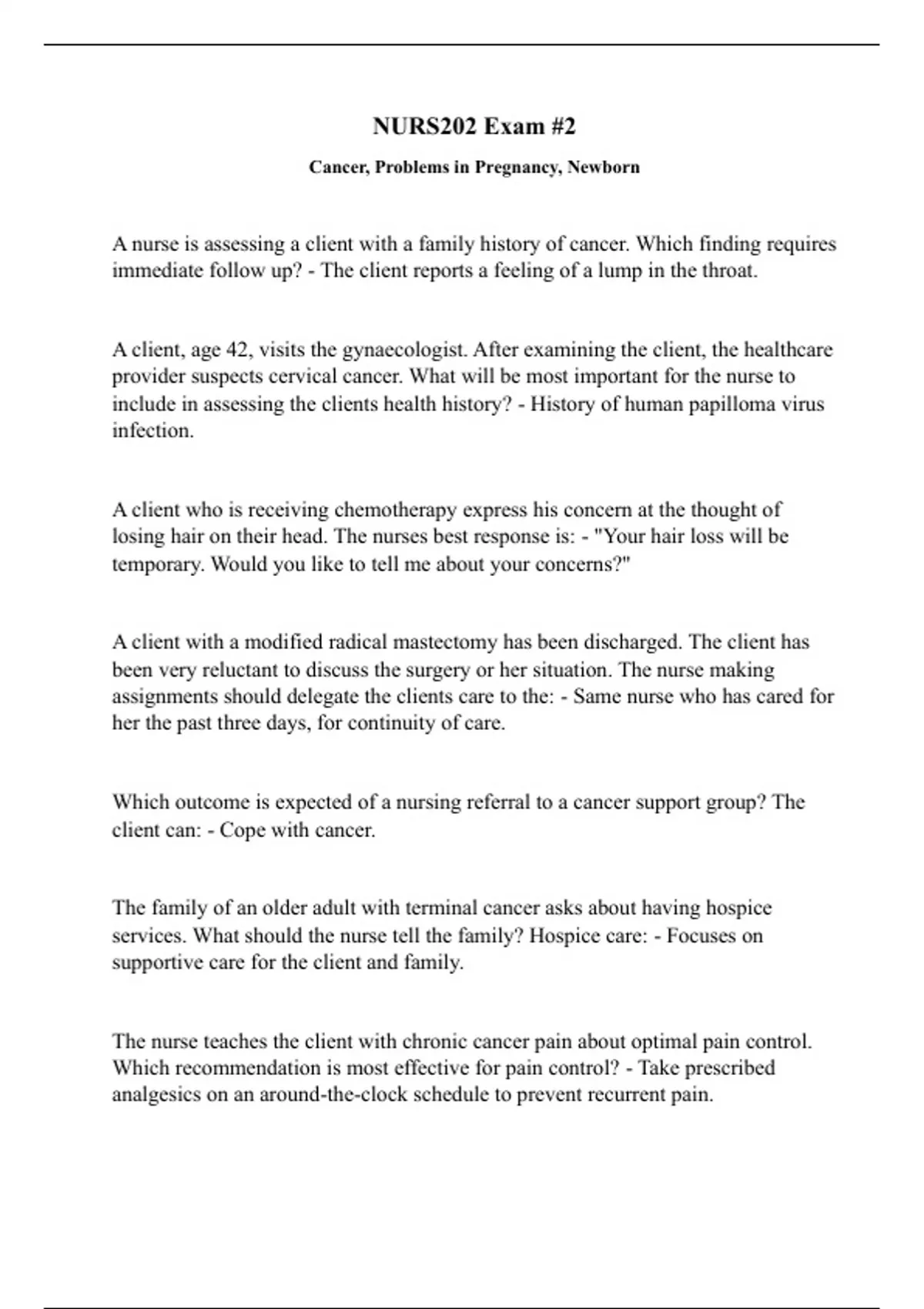 A nurse is assessing a client with a family history of cancer. Which finding requires immediate follow up? - The client reports a feeling of a lump in the throat. A client, age 42, visits the gynaecologist. After examining the client, the healthcare provider suspects cervical cancer. What will be most important for the nurse to include in assessing the clients health history? - History of human papilloma virus infection. A client who is receiving chemotherapy express his concern at the thought of losing hair on their head. The nurses best response is: - "Your hair loss will be temporary. Would you like to tell me about your concerns?" A client with a modified radical mastectomy has been discharged. The client has been very reluctant to discuss the surgery or her situation. The nurse making assignments should delegate the clients care to the: - Same nurse who has cared for her the past three days, for continuity of care. Which outcome is expected of a nursing referral to a cancer support group? The client can: - Cope with cancer. The family of an older adult with terminal cancer asks about having hospice services. What should the nurse tell the family? Hospice care: - Focuses on supportive care for the client and family. The nurse teaches the client with chronic cancer pain about optimal pain control. Which recommendation is most effective for pain control? - Take prescribed analgesics on an around-the-clock schedule to prevent recurrent pain.Which strategy would be most effective in improving trans cultural communications with oncology clients and their families? - Establish a rapport and listen to their concerns. The nurse is teaching a client who is receiving chemotherapy and the family how to manage possible nausea and vomiting at home. What information should the nurse include in the teaching plan? - Eating small frequent meals A client with chronic cancer pain has been receiving opiates for four months. She rated the pain as an eight on a 10 point scale before starting the opioid medication. Following a thorough examination, there is no new evidence of increased disease, yet the pain is close to eight again. What is the most likely explanation for the increasing pain? - Tolerance to the opioid A nurse is conducting a cancer risk screening program. Which client is at greatest risk for skin cancer? - 60 year old mountain biker The client with brown hair is concerned about losing hair as a result of chemotherapy. What should the nurse tell the client? - "The hair loss is temporary. " The nurse is witnessing the client signature on the inform the surgical consent for an abdominal hysterectomy. The nurse should be certain the client understands that what will be the outcome of the surgery? - Infertility The client with stage to ovarian cancer undergoes a total abdominal hysterectomy and bilateral salpingo-oophorectomy with tumor resection, omentectomt, appendectomy, and Lymphadenectomy. During the second postoperative day, which assessment finding requires immediate intervention? - Shallow breathing and increasing lethargyA client ask the nurse with PSA is. The nurse should reply that it stands for: - Prostate-specific antigen, which is used to screen for prostate cancer A client is undergoing a left modified radical mastectomy for breast cancer. Postoperatively, blood pressure should be a clean from the right arm, and the clients left arm and hand should be elevated as much as possible to prevent: - Lymphedema