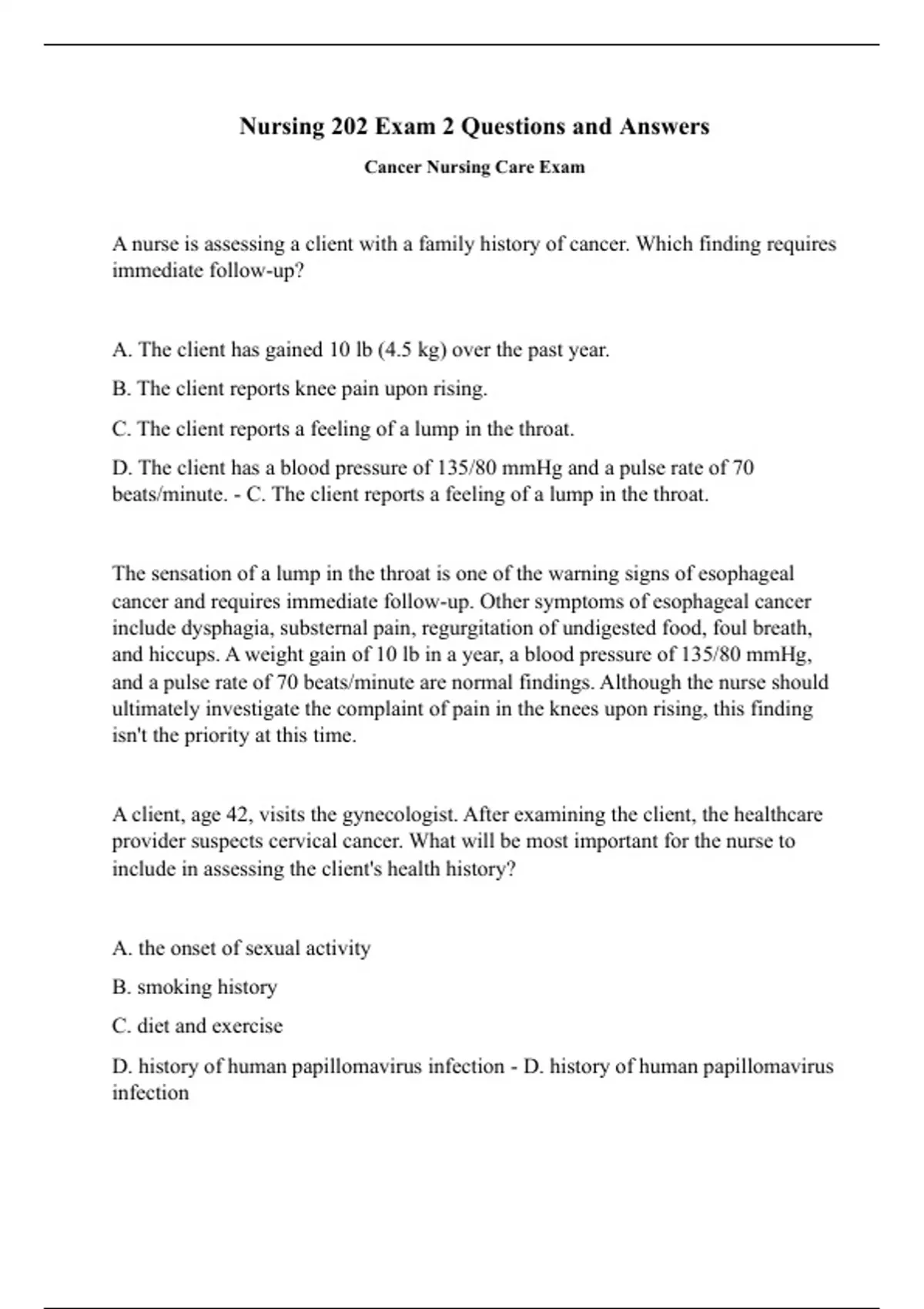 A nurse is assessing a client with a family history of cancer. Which finding requires immediate follow-up? A. The client has gained 10 lb (4.5 kg) over the past year. B. The client reports knee pain upon rising. C. The client reports a feeling of a lump in the throat. D. The client has a blood pressure of 135/80 mmHg and a pulse rate of 70 beats/minute. - C. The client reports a feeling of a lump in the throat. The sensation of a lump in the throat is one of the warning signs of esophageal cancer and requires immediate follow-up. Other symptoms of esophageal cancer include dysphagia, substernal pain, regurgitation of undigested food, foul breath, and hiccups. A weight gain of 10 lb in a year, a blood pressure of 135/80 mmHg, and a pulse rate of 70 beats/minute are normal findings. Although the nurse should ultimately investigate the complaint of pain in the knees upon rising, this finding isn't the priority at this time. A client, age 42, visits the gynecologist. After examining the client, the healthcare provider suspects cervical cancer. What will be most important for the nurse to include in assessing the client's health history? A. the onset of sexual activity B. smoking history C. diet and exercise D. history of human papillomavirus infection - D. history of human papillomavirus infectionThe nurse would assess for risk factors associated with cervical cancer. The most important risk factor for cervical cancer is human papillomavirus infection. The onset of sexual activity may indirectly increase the risk of cervical cancer. Smoking is a risk factor for cervical cancer but not the most important one. Diet and exercise are not important risk factors for cervical cancer. A client who is receiving chemotherapy expresses concern at the thought of losing hair on the head. The nurse's best response is: A. "Don't worry about your hair loss. A good wig can disguise that." B. "No one knows how long it will take your hair to grow back. You'll have to learn to cope with its loss." C. "A little hair loss shouldn't concern you. You have more serious things to worry about." D. "Your hair loss will be temporary. Would you like to tell me about your concerns?" - D. "Your hair loss will be temporary. Would you like to tell me about your concerns?" Alopecia, which can occur with the administration of some chemotherapeutic agents, is psychologically disturbing for many clients even though the loss is temporary. Clients should be reassured that their hair will grow back. The nurse should encourage the client to discuss any concerns and should explore the various options available to the client (e.g., caps, wigs, scarves, turbans). Telling the client not to worry about hair loss or that there are more serious worries trivializes the client's concerns. Telling the client to learn to cope with hair loss conveys negativity and harsh judgment and is likely to demoralize the client. A client with a modified radical mastectomy is being discharged. The client has been very reluctant to discuss the surgery or her situation. The nurse making assignments should delegate the client's care to the:A. unlicensed assistive personnel (UAP) because the client is stable and being discharged. B. same nurse who has cared for her the past 3 days, for continuity of care. C. nurse in orientation who needs experience in discharge instructions. D. nurse with the most bed baths, because this client will not need a bath. - B. same nurse who has cared for her the past 3 days, for continuity of care. Continuity of care is crucial for this client to feel more comfortable about asking questions and discussing her care at home. A UAP does not have the educational preparation (registered nursing license) to provide discharge instructions. It is not appropriate to assign this client to a nurse in orientation or one who needs assistance; the priority need is continuity of care. Which outcome is expected of a nursing referral to a cancer support group? The client can: A. choose the best treatment options. B. find financial help. C. obtain home health care. D. cope with cancer. - D. cope with cancer. Support groups are designed to educate clients and their families experiencing cancer about the disease and methods of coping positively with it. These are selfhelp and support groups monitored by professionals and cancer survivors who have undergone a training course that helps them to facilitate small groups. The family of an older adult with terminal cancer asks about having hospice services. What should the nurse tell the family?Hospice care: A. focuses only on the needs of the client. B. can only be provided in the inpatient setting. C. is staffed exclusively by professional health care workers. D. focuses on supportive care for the client and family. - D. focuses on supportive care for the client and family. Hospice care focuses on supportive care for the client and family. Care for the family may continue throughout the bereavement period. Hospice care involves care of the client at home as well as in an inpatient setting. Although professional care is provided in hospice, family members, volunteers, and unlicensed nursing personnel (UAP) also participate in the care of the client. The nurse teaches the client with chronic cancer pain about optimal pain control. Which recommendation is most effective for pain control? A. Get used to some pain, and use a little less medication than needed to keep from being addicted. B. Take prescribed analgesics on an around-the-clock schedule to prevent recurrent pain. C. Take analgesics only when pain returns. D. Take enough analgesics around the clock so that you can sleep 12 to 16 hours a day to block the pain. - B. Take prescribed analgesics on an around-the-clock schedule to prevent recurrent pain. The regular administration of analgesics provides a consistent serum level of medication, which can help prevent breakthrough pain. Therefore, taking the prescribed analgesics on a regular schedule is th
