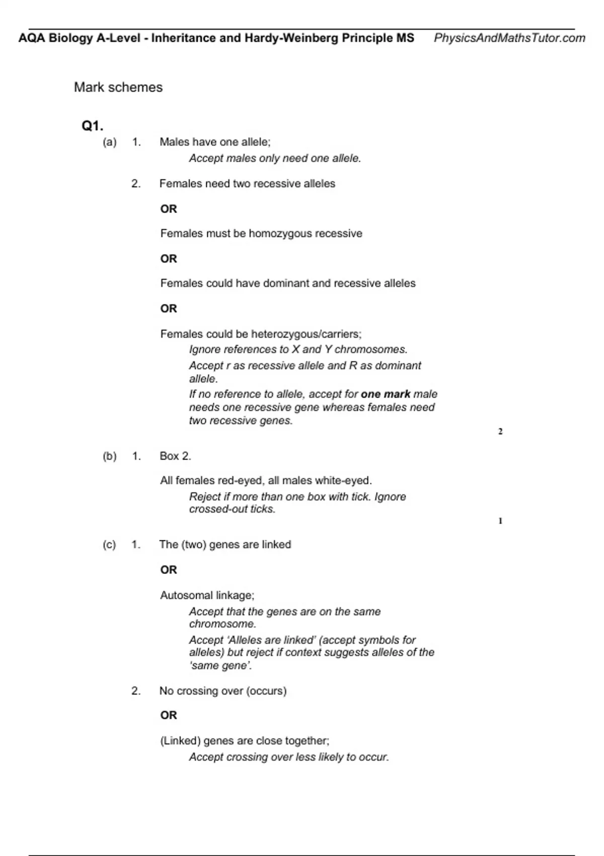 , AQA Biology A-Level - Inheritance and Hardy-Weinberg Principle MS PhysicsAndMathsTutor.com