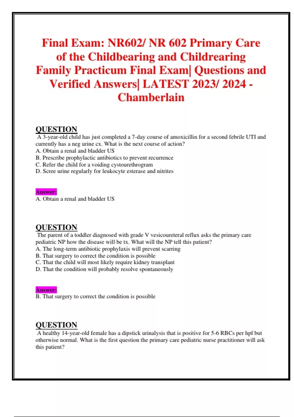 Final Exam: NR602/ NR 602 Primary Care of the Childbearing and Childrearing Family Practicum Final Exam| Questions and Verified Answers| LATEST 2023/ 2024 - Chamberlain QUESTION A 3-year-old child has just completed a 7-day course of amoxicillin for a second febrile UTI and currently has a neg urine cx. What is the next course of action? A. Obtain a renal and bladder US B. Prescribe prophylactic antibiotics to prevent recurrence C. Refer the child for a voiding cystourethrogram D. Scree urine regularly for leukocyte esterase and nitrites Answer: A. Obtain a renal and bladder US QUESTION The parent of a toddler diagnosed with grade V vesicoureteral reflux asks the primary care pediatric NP how the disease will be tx. What will the NP tell this patient? A. The long-term antibiotic prophylaxis will prevent scarring B. That surgery to correct the condition is possible C. That the child will most likely require kidney transplant D. That the condition will probably resolve spontaneously Answer: B. That surgery to correct the condition is possible QUESTION A healthy 14-year-old female has a dipstick urinalysis that is positive for 5-6 RBCs per hpf but otherwise normal. What is the first question the primary care pediatric nurse practitioner will ask this patient? a. "Are you sexually active?" b. "Are you taking any medications?" c. "Have you had a recent fever?" d. "When was your last menstrual period (LMP)?" Answer: d. "When was your last menstrual period (LMP)?" QUESTION A child has gross hematuria, abdominal pain, and arthr