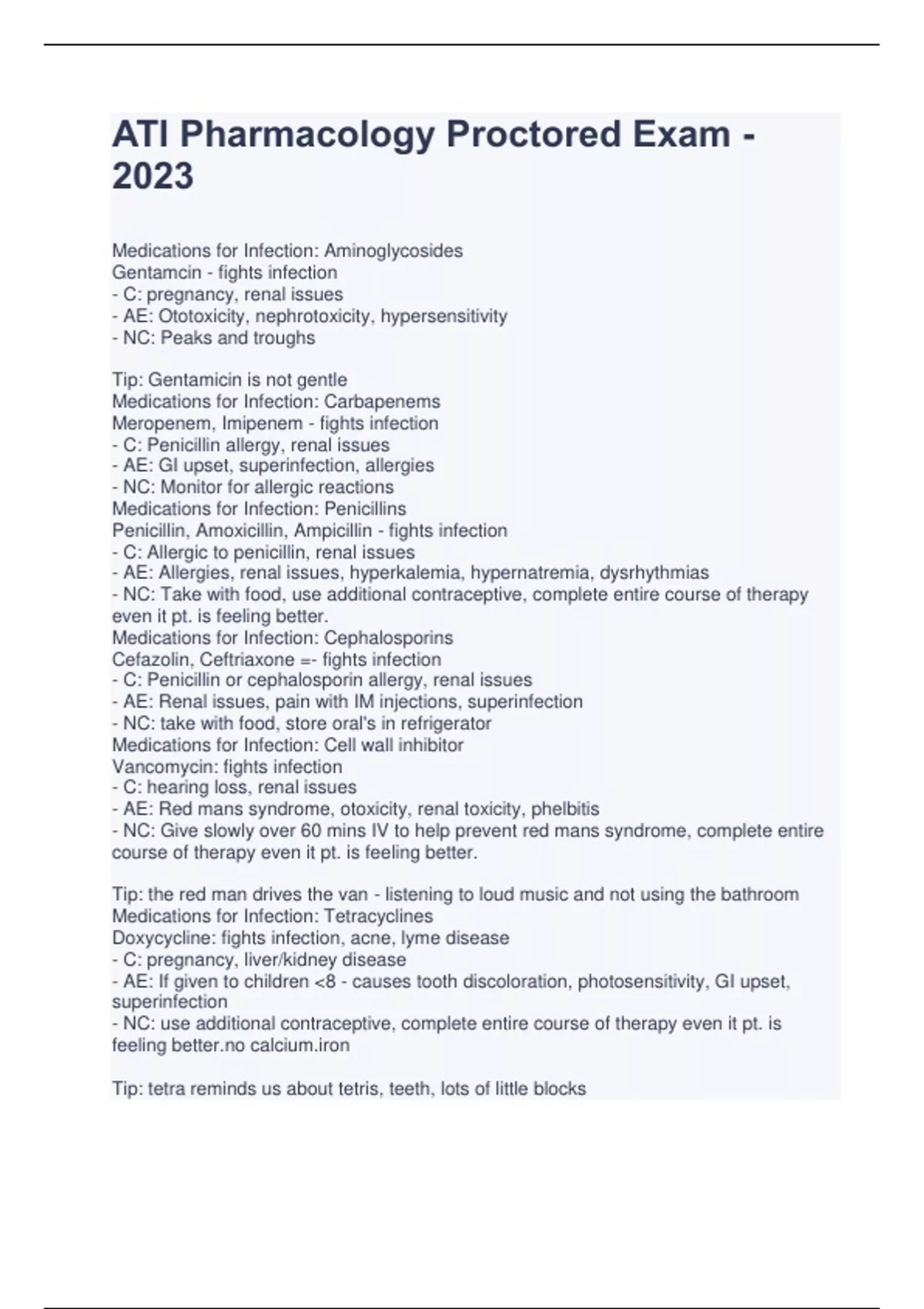 ATI Pharmacology Proctored Exam - 2023 Medications for Infection: Aminoglycosides Gentamcin - fights infection - C: pregnancy, renal issues - AE: Ototoxicity, nephrotoxicity, hypersensitivity - NC: Peaks and troughs Tip: Gentamicin is not gentle Medications for Infection: Carbapenems Meropenem, Imipenem - fights infection - C: Penicillin allergy, renal issues - AE: GI upset, superinfection, allergies - NC: Monitor for allergic reactions Medications for Infection: Penicillins Penicillin, Amoxicillin, Ampicillin - fights infection - C: Allergic to penicillin, renal issues - AE: Allergies, renal issues, hyperkalemia, hypernatremia, dysrhythmias - NC: Take with food, use additional contraceptive, complete entire course of therapy even it pt. is feeling better. Medications for Infection: Cephalosporins Cefazolin, Ceftriaxone =- fights infection - C: Penicillin or cephalosporin allergy, renal issues - AE: Renal issues, pain with IM injections, superinfection - NC: take with food, store oral's in refrigerator Medications for Infection: Cell wall inhibitor Vancomycin: fights infection - C: hearing loss, renal issues - AE: Red mans syndrome, otoxicity, renal toxicity, phelbitis - NC: Give slowly over 60 mins IV to help prevent red mans syndrome, complete entire course of therapy even it pt. is feeling better. Tip: the red man drives the van - listening to loud music and not using the bathroom Medications for Infection: Tetracyclines Doxycycline: fights infection, acne, lyme disease - C: pregnancy, liver/kidney disease - AE: If given to children <8 - causes tooth discoloration, photosensitivity, GI upset, superinfection - NC: use additional contraceptive, complete entire course of therapy even it pt. is feeling Tip: tetra reminds us about tetris, teeth, lots of little blocks Medications for Infection: Macrolides Erythromycin, Azithromycin (z-pak) - fights infections, pneumonia, pertussis, chlamydia (is an alt. med. for those who are allergic to penicillin) - C: Liver disease, prolonged QT - AE: GI upset, ototoxicity, prolonged QT - NC: Use additional contraceptive, if treating an STD - treat partner as well. Tip: throw mice - slide because of phlegm Medications for Infection: Sulfonamides & Trimethoprim Trimethoprim-silfamethoxazole - treats UTI's - C: Pregnancy/lactation, folate deficiency, renal issues - AE: Agranulocytosis, hyperkalemia, hypersensitivity - NC: Take on an empty stomach! Use additional contraceptive, complete entire course of therapy even it pt. is feeling better. Medications for Infection: Urinary tract antiseptic Nitrofurantoin: treats UTI's - C: pregnancy/lactation, renal issues - AE: GI upset, peripheral neuropathy - NC: turns urine rust-yellow to brown, can stain teeth, complete entire course of therapy even it pt. is feeling better. Medications for Infection: Fluoroquinolones Ciprofloxacin - fights infection - C: Can cause spontaneous tendon rupture in children <18, pregnancy/lactation - AE: GI upset, tendon rupture, superinfection, phototoxicity - NC: Low doses in pt's with renal impairment, complete entire course of therapy even it pt. is feeling better. tip: that fox likes to eat tendons Medications for Infection: UT analgesic Phenazopyridine: treats UTI's (is a dye that functions as a local anesthetic on the mucosa of the urinary tract) Medications for Infection: Antiprotozoals Metronidazole: treats protozoal infections - C: pregnancy, kidney/cardiac/fungal/candida infection, seizure disorder - AE: GI upset, darkening of urine, neurotoxicity, superinfection - NC: Use additional birth control Tip: met- metalic tastse, zole, protozoal Medications for Infection: Antimycobacterials Isoniazid: treats tuberculosis - C: older adults, people with diabetes, alcoholism - AE: hepatotoxicity, hyperglycemia, peripheral neuropathy - NC: Use additional birth control Rifampin: treats infection & TB - C: hepatic impairment - AE: Can turn excretory fluids orange, GI upset, superinfection, hepatotoxicity - NC: Full glass of water, non-hormonal contraceptio