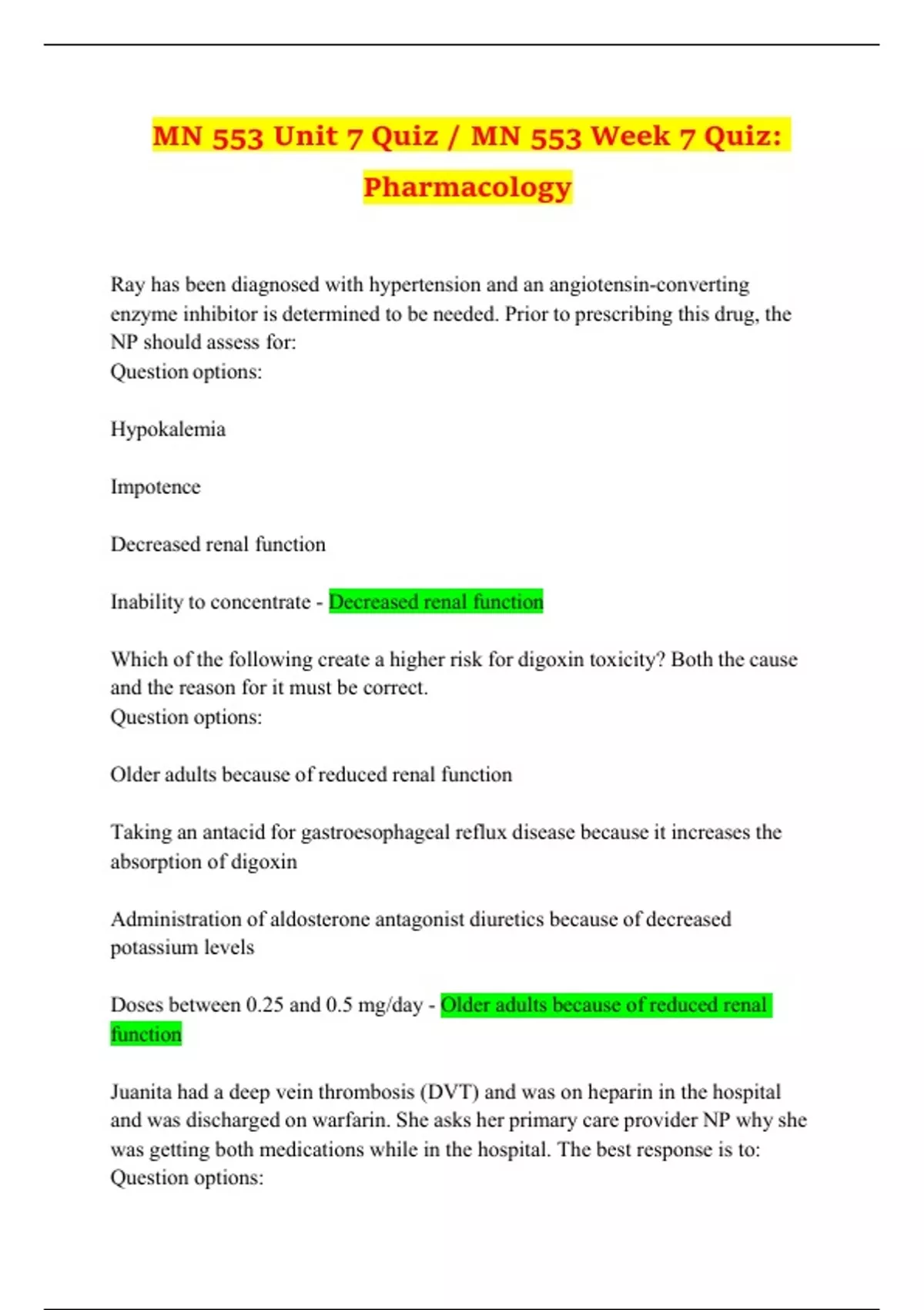 MN 553 Unit 7 Quiz / MN 553 Week 7 Quiz: Pharmacology Ray has been diagnosed with hypertension and an angiotensin-converting enzyme inhibitor is determined to be needed. Prior to prescribing this drug, the NP should assess for: Question options: Hypokalemia Impotence Decreased renal function Inability to concentrate - Decreased renal function Which of the following create a higher risk for digoxin toxicity? Both the cause and the reason for it must be correct. Question options: Older adults because of reduced renal function Taking an antacid for gastroesophageal reflux disease because it increases the absorption of digoxin Administration of aldosterone antagonist diuretics because of decreased potassium levels Doses between 0.25 and 0.5 mg/day - Older adults because of reduced renal function