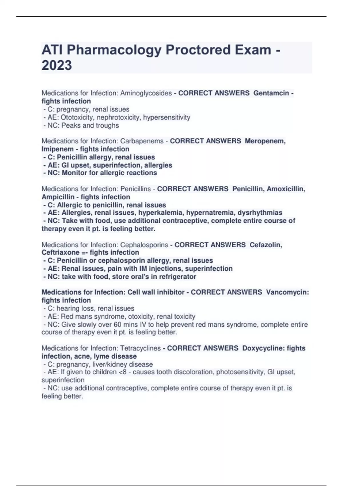 ATI Pharmacology Proctored Exam - 2023 Medications for Infection: Aminoglycosides - CORRECT ANSWERS Gentamcin - fights infection - C: pregnancy, renal issues - AE: Ototoxicity, nephrotoxicity, hypersensitivity - NC: Peaks and troughs Medications for Infection: Carbapenems - CORRECT ANSWERS Meropenem, Imipenem - fights infection - C: Penicillin allergy, renal issues - AE: GI upset, superinfection, allergies - NC: Monitor for allergic reactions Medications for Infection: Penicillins - CORRECT ANSWERS Penicillin, Amoxicillin, Ampicillin - fights infection - C: Allergic to penicillin, renal issues - AE: Allergies, renal issues, hyperkalemia, hypernatremia, dysrhythmias - NC: Take with food, use additional contraceptive, complete entire course of therapy even it pt. is feeling better. Medications for Infection: Cephalosporins - CORRECT ANSWERS Cefazolin, Ceftriaxone =- fights infection - C: Penicillin or cephalosporin allergy, renal issues - AE: Renal issues, pain with IM injections, superinfection - NC: take with food, store oral's in refrigerator Medications for Infection: Cell wall inhibitor - CORRECT ANSWERS Vancomycin: fights infection - C: hearing loss, renal issues - AE: Red mans syndrome, otoxicity, renal toxicity - NC: Give slowly over 60 mins IV to help prevent red mans syndrome, complete entire course of therapy even it pt. is feeling better. Medications for Infection: Tetracyclines - CORRECT ANSWERS Doxycycline: fights infection, acne, lyme disease - C: pregnancy, liver/kidney disease - AE: If given to children <8 - causes tooth discoloration, photosensitivity, GI upset, superinfection - NC: use additional contraceptive, complete entire course of therapy even it pt. is feeling better. Medications for Infection: Macrolides - CORRECT ANSWERS Erythromycin, Azithromycin (z-pak) - fights infections, pneumonia, pertussis, chlamydia (is an alt. med. for those who are allergic to penicillin) - C: Liver disease, prolonged QT - AE: GI upset, ototoxicity, prolonged QT - NC: Use additional contraceptive, if treating an STD - treat partner as well. Medications for Infection: Sulfonamides & Trimethoprim - CORRECT ANSWERS Trimethoprim-silfamethoxazole - treats UTI's - C: Pregnancy/lactation, folate deficiency, renal issues - AE: Agranulocytosis, hyperkalemia, hypersensitivity - NC: Take on an empty stomach! Use additional contraceptive, complete entire course of therapy even it pt. is feeling better. Medications for Infection: Urinary tract antiseptic - CORRECT ANSWERS Nitrofurantoin: treats UTI's - C: pregnancy/lactation, renal issues - AE: GI upset, peripheral neuropathy - NC: turns urine rust-yellow to brown, can stain teeth, complete entire course of therapy even it pt. is feeling better. Medications for Infection: Fluoroquinolones - CORRECT ANSWERS Ciprofloxacin - fights infection - C: Can cause spontaneous tendon rupture in children <18, pregnancy/lactation - AE: GI upset, tendon rupture, superinfection, phototoxicity - NC: Low doses in pt's with renal impairment, complete entire course of therapy even it pt. is feeling better. Medications for Infection: UT analgesic - CORRECT ANSWERS Phenazopyridine: treats UTI's (is a dye that functions as a local anesthetic on the mucosa of the urinary tract) Medications for Infection: Antiprotozoals - CORRECT ANSWERS Metronidazole: treats protozoal infections - C: pregnancy, kidney/cardiac/fungal/candida infection, seizure disorder - AE: GI upset, darkening of urine, neurotoxicity, superinfection - NC: Use additional birth control Medications for Infection: Antimycobacterials - CORRECT ANSWERS Isoniazid: treats tuberculosis - C: older adults, people with diabetes, alcoholism - AE: hepatotoxicity, hyperglycemia, peripheral neuropathy - NC: Use additional birth control Rifampin: treats infection & TB - C: hepatic impairment - AE: Can turn excretory fluids orange, GI upset, superinfection, hepatotoxicity - NC: Full glass of water, non-hormonal contraception Medications for Infection: Antifungals - CORRECT ANSWERS Amphote
