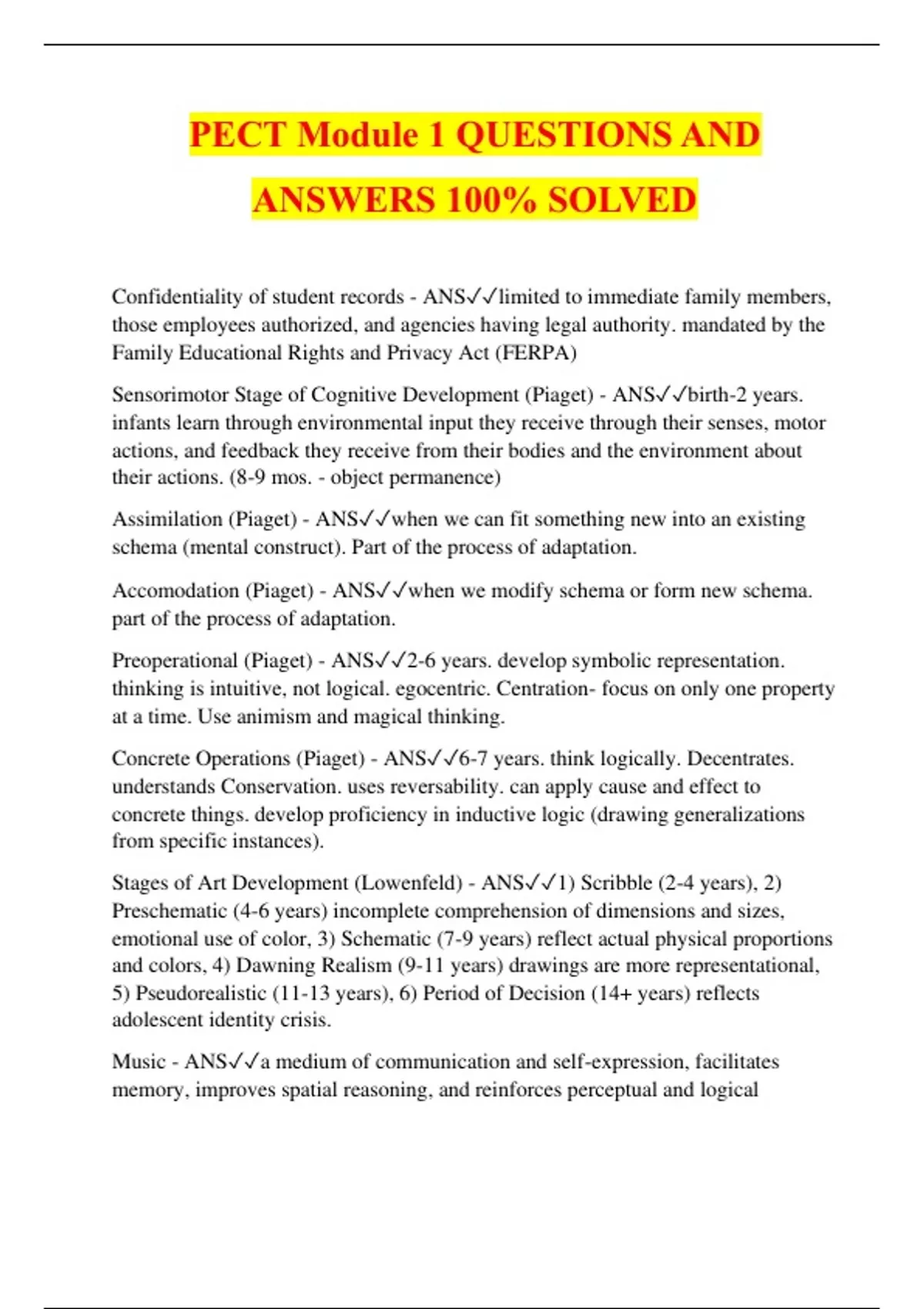 PECT Module 1 QUESTIONS AND ANSWERS 100% SOLVED Confidentiality of student records - ANSlimited to immediate family members, those employees authorized, and agencies having legal authority. mandated by the Family Educational Rights and Privacy Act (FERPA) Sensorimotor Stage of Cognitive Development (Piaget) - ANSbirth-2 years. infants learn through environmental input they receive through their senses, motor actions, and feedback they receive from their bodies and the environment about their actions. (8-9 mos. - object permanence) Assimilation (Piaget) - ANSwhen we can fit something new into an existing schema (mental construct). Part of the process of adaptation. Accomodation (Piaget) - ANSwhen we modify schema or form new schema. part of the process of adaptation. Preoperational (Piaget) - ANS2-6 years. develop symbolic representation. thinking is intuitive, not logical. egocentric. Centration- focus on only one property at a time. Use animism and magical thin