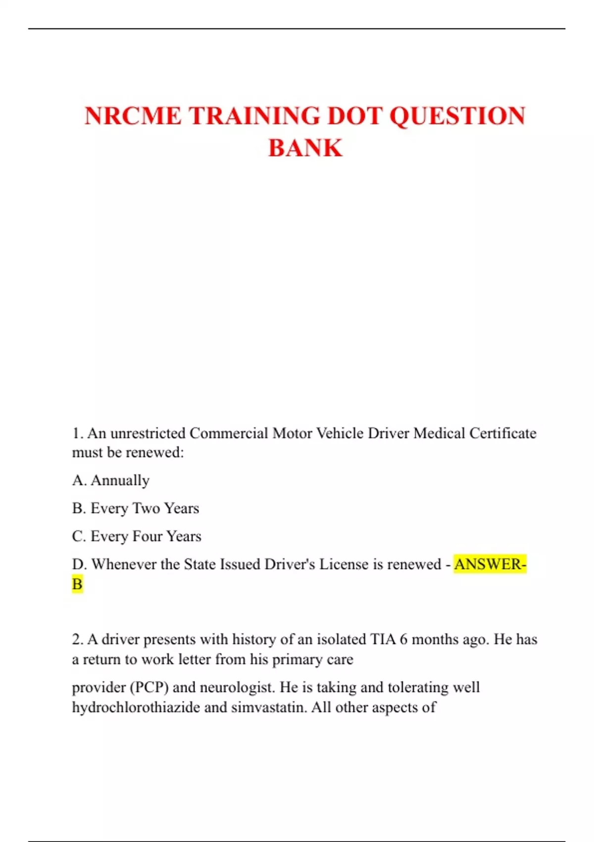 NRCME TRAINING DOT QUESTION BANK