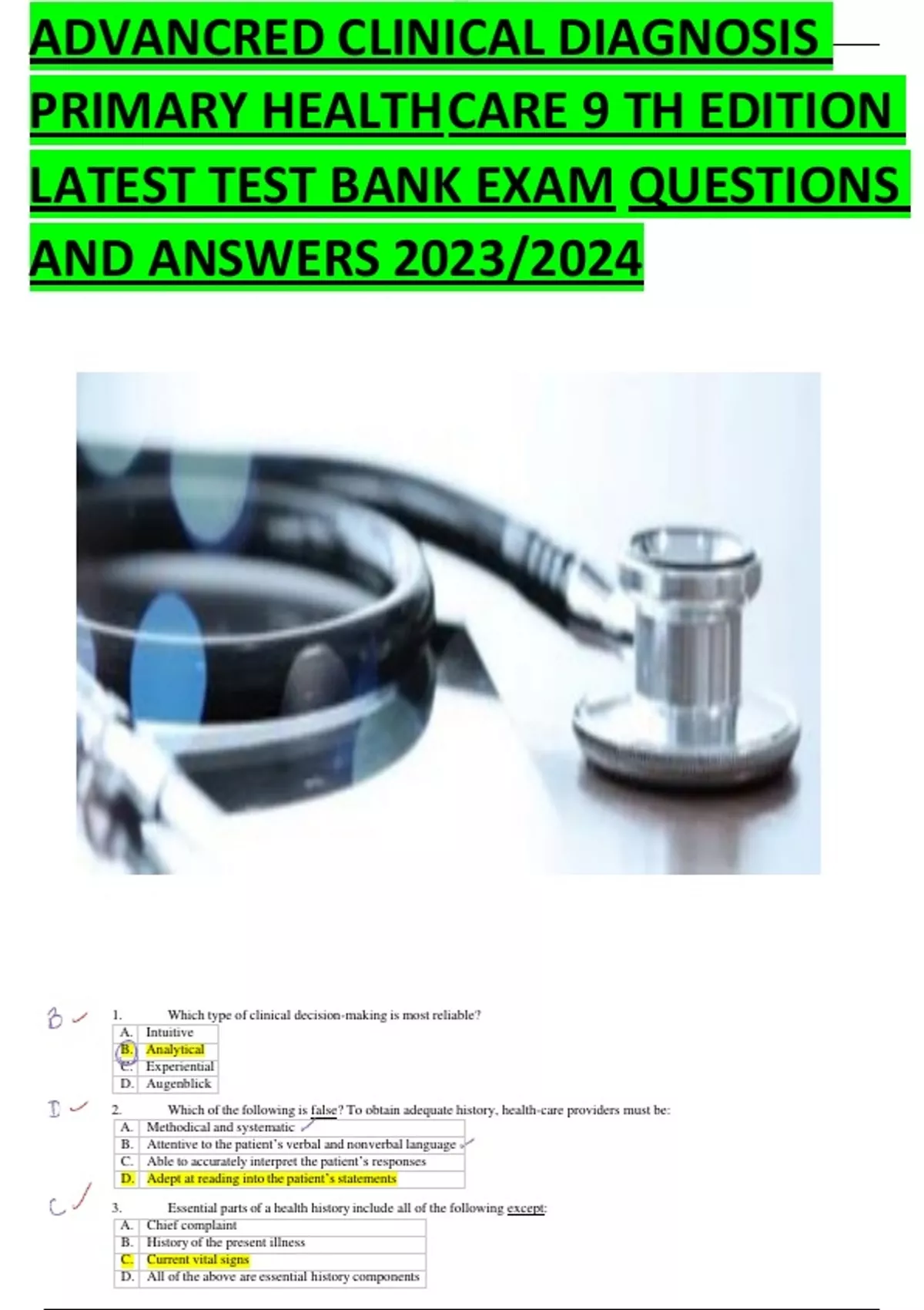 ADVANCRED CLINICAL DIAGNOSIS PRIMARY HEALTH CARE 9 TH EDITION LATEST TEST BANK EXAM QUESTIONS AND ANSWERS 2023/2024