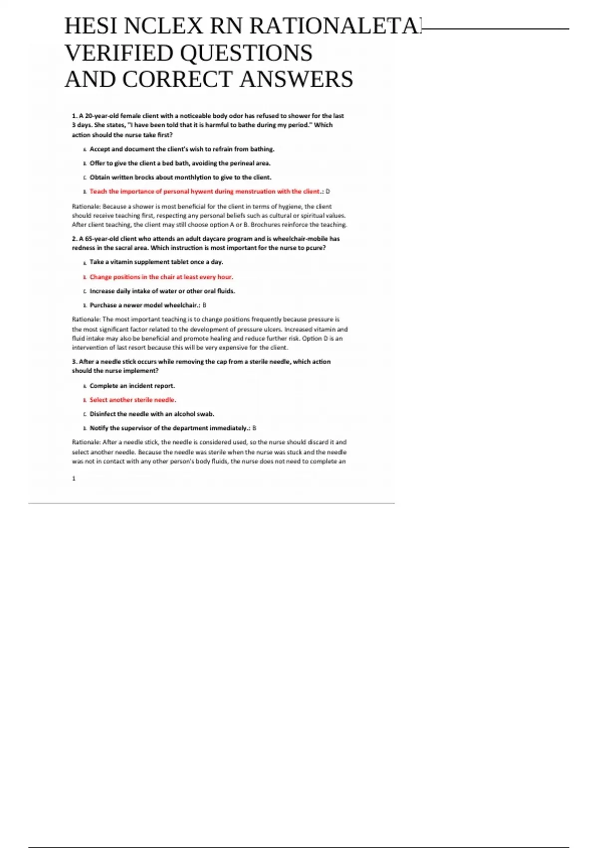 1. A 20-year-old female client with a noticeable body odor has refused to shower for the last 3 days. She states, "I have been told that it is harmful to bathe during my period." Which action should the nurse take first? A. Accept and document the client's wish to refrain from bathing. B. Offer to give the client a bed bath, avoiding the perineal area. C. Obtain written brocks about monthlytion to give to the client. D. Teach the importance of personal hywent during menstruation with the client.: D Rationale: Because a shower is most beneficial for the client in terms of hygiene, the client should receive teaching first, respecting any personal beliefs such as cultural or spiritual values. After client teaching, the client may still choose option A or B. Brochures reinforce the teaching. 2. A 65-year-old client who attends an adult daycare program and is wheelchair-mobile has redness in the sacral area. Which instruction is most important for the nurse to pcure? A. Take a vitamin supplement tablet once a day. B. Change positions in the chair at least every hour. C. Increase daily intake of water or other oral fluids. D. Purchase a newer model wheelchair.: B Rationale: The most important teaching is to change positions frequently because pressure is the most significant factor related to the development of pressure ulcers. Increased vitamin and fluid intake may also be beneficial and promote healing and reduce further risk. Option D is an intervention of last resort because this will be very expensive for the client. 3. After a needle stick occurs while removing the cap from a sterile needle, which action should the nurse implement? A. Complete an incident report. B. Select another sterile needle. C. Disinfect the needle with an alcohol swab. D. Notify the supervisor of the department immediately.: B Rationale: After a needle stick, the needle is considered used, so the nurse should discard it and select another needle. Because the needle was sterile when the nurse was stuck and the needle was not in contact with any other person's body fluids, the nurse does not need to complete an 1 HESI NCLEX RN RATIONALETALVERIFIED QUESTIONS AND CORRECT ANSWERS 11/4/23, 6:10 PM HESI Nclex RN EXAM - 2023 QUESTIONS AND CORRECT VERIFIED AN… about:blank 2/42 incident report or notify the occupational health nurse. Disinfecting a needle with an alcohol swab is not in accordance with standards for safe practice and infection control. 4. After receiving written and verbal instructions from a clinic nurse about a newly prescribed medication, a client asks the nurse what to do if questions arise about the medication after getting home. How should the nurse respond? A. Provide the client with a list of Internet sites that answer frequently asked questions about medications. B. Advise the client to obtain a current edition of a drug reference book from a local bookstore or library. C. Reassure the client that information about the medication is included in the written instructions. D. Encourage the client to call the clinic nurse or health care provider if any questions arise.: D Rationale: To ensure safe medication use, the nurse should encourage the client to call the nurse or health care provider if any questions arise. Options A, B, and C may all include useful information, but these sources of information cannot evaluate the nature of the client's questions and the follow-up needed. 5. After the nurse tells an older client that an IV line needs to be inserted, the client becomes very apprehensive, loudly verbalizing a dislike for all health care providers and nurses. How should the nurse respond? A. Ask the client to remain quiet so the procedure can be performed safely. B. Concentrate on completing the insertion as efficiently as possible. C. Calmly reassure the client that the discomfort will be temporary. D. Tell the client a joke as a means of distraction from the procedure.: C Rationale: The nurse should respond with a calm demeanor to help reduce the client's apprehension. After responding calmly to the client's apprehension, the nurse may implement to ensure safe completion of the procedure. 6. Based on the nursing diagnosis of risk for infection, which intervention is best for the nurse to implement when providing care for an older incontinent client? A. Maintain standard precautions. B. Initiate contact isolation measures. C. Insert an indwelling urinary cathete