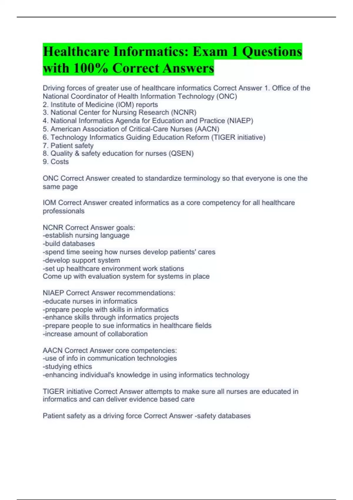 Driving forces of greater use of healthcare informatics Correct Answer 1. Office of the National Coordinator of Health Information Technology (ONC) 2. Institute of Medicine (IOM) reports 3. National Center for Nursing Research (NCNR) 4. National Informatics Agenda for Education and Practice (NIAEP) 5. American Association of Critical-Care Nurses (AACN) 6. Technology Informatics Guiding Education Reform (TIGER initiative) 7. Patient safety 8. Quality & safety education for nurses (QSEN) 9. Costs ONC Correct Answer created to standardize terminology so that everyone is one the same page IOM Correct Answer created informatics as a core competency for all healthcare professionals NCNR Correct Answer goals: -establish nursing language -build databases -spend time seeing how nurses develop patients' cares -develop support system -set up healthcare environment work stations Come up with evaluation system for systems in place NIAEP Correct Answer recommendations: -educate nurses in informatics -prepare people with skills in informatics -enhance skills through informatics projects -prepare people to sue informatics in healthcare fields -increase amount of collaboration AACN Correct Answer core competencies: -use of info in communication technologies -studying ethics -enhancing individual's knowledge in using informatics technology TIGER initiative Correct Answer attempts to make sure all nurses are educated in informatics and can deliver evidence based care Patient safety as a driving force Correct Answer -safety databases