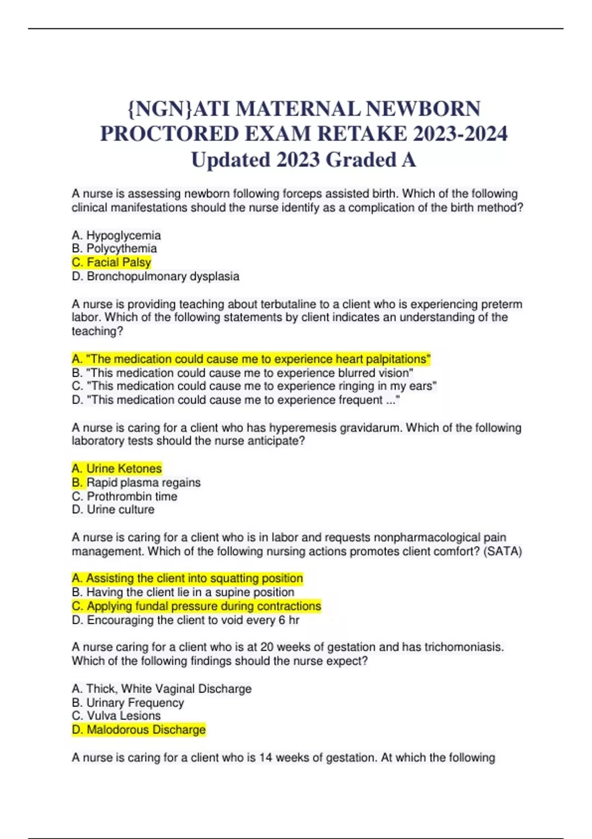 {NGN}ATI MATERNAL NEWBORN PROCTORED EXAM RETAKE Updated 2023 Graded A A nurse is assessing newborn following forceps assisted birth. Which of the following clinical manifestations should the nurse identify as a complication of the birth method? A. Hypoglycemia B. Polycythemia C. Facial Palsy D. Bronchopulmonary dysplasia A nurse is providing teaching about terbutaline to a client who is experiencing preterm labor. Which of the following statements by client indicates an understanding of the teaching? A. "The medication could cause me to experience heart palpitations" B. "This medication could cause me to experience blurred vision" C. "This medication could cause me to experience ringing in my ears" D. "This medication could cause me to experience frequent ..." A nurse is caring for a client who has hyperemesis gravidarum. Which of the following laboratory tests should the nurse anticipate? A. Urine Ketones B. Rapid plasma regains C. Prothrombin time D. Urine culture A nurse is caring for a client who is in labor and requests nonpharmacological pain management. Which of the following nursing actions promotes client comfort? (SATA) A. Assisting the client into squatting position B. Having the client lie in a supine position C. Applying fundal pressure during contractions D. Encouraging the client to void every 6 hr A nurse caring for a client who is at 20 weeks of gestation and has trichomoniasis. Which of the following findings should the nurse expect? A. Thick, White Vaginal Discharge B. Urinary Frequency C. Vulva Lesions D. Malodorous Discharge A nurse is caring for a client who is 14 weeks of gestation. At which the following locations should the nurse place the Doppler device when assessing the fetal heart rate? A. Midline 2 to 3 cm (0.8 to 1.2 in) above the symphysis pubis B. Left Upper Abdomen C. Two fingerbreadths above the umbilicus D. Lateral at the Xiphoid Process A nurse is assessing a client who is at 27 weeks of gestation and has preeclampsia. Which of the following findings should the nurse report to the provider? A. Urine protein concentration 200 mg/ 24 hr B. Creatinine 0.8 mg/ dL C. Hemoglobin 14.8 g/ dL D. Platelet Count 60.000/ mm3 A nurse is teaching about clomiphene citrate to a client who is experiencing infertility. Which of the following adverse effect should the nurse include? A. Tinnitus B. Urinary Frequency C. Breast Tenderness D. Chills A nurse is assessing a newborn upon admission to the nursery. Which of the following should the nurse expect? A. Bulging Fontanels B. Nasal Flaring C. Length from head to heel of 40 cm (15.7 in) D. Chest circumference 2 cm (0.8 in) smaller than the head circumference A nurse is planning care for a newborn who has neonatal abstinence syndrome. Which of the following interventions should the nurse include in the plan of care. A. Increase the newborn's visual stimulation B. Weigh the newborn every other day C. Discourage parental interaction until after a social evaluation D. Swaddle the newborn in a flexed position A nurse is caring for a newborn who is 6 hr old and has a bedside glucometer reading of 65 mg/ dL. The newborn's mother has type 2 diabetes mellitus. Which of the following actions should the nurse take? A. Obtain a blood sample for a serum glucose level B. Feed the newborn immediately C. Administer 50 mL of dextrose solution IV D. Reassess the blood glucose level prior to the next feeding A charge nurse is teaching a group of staff nurses about fetal