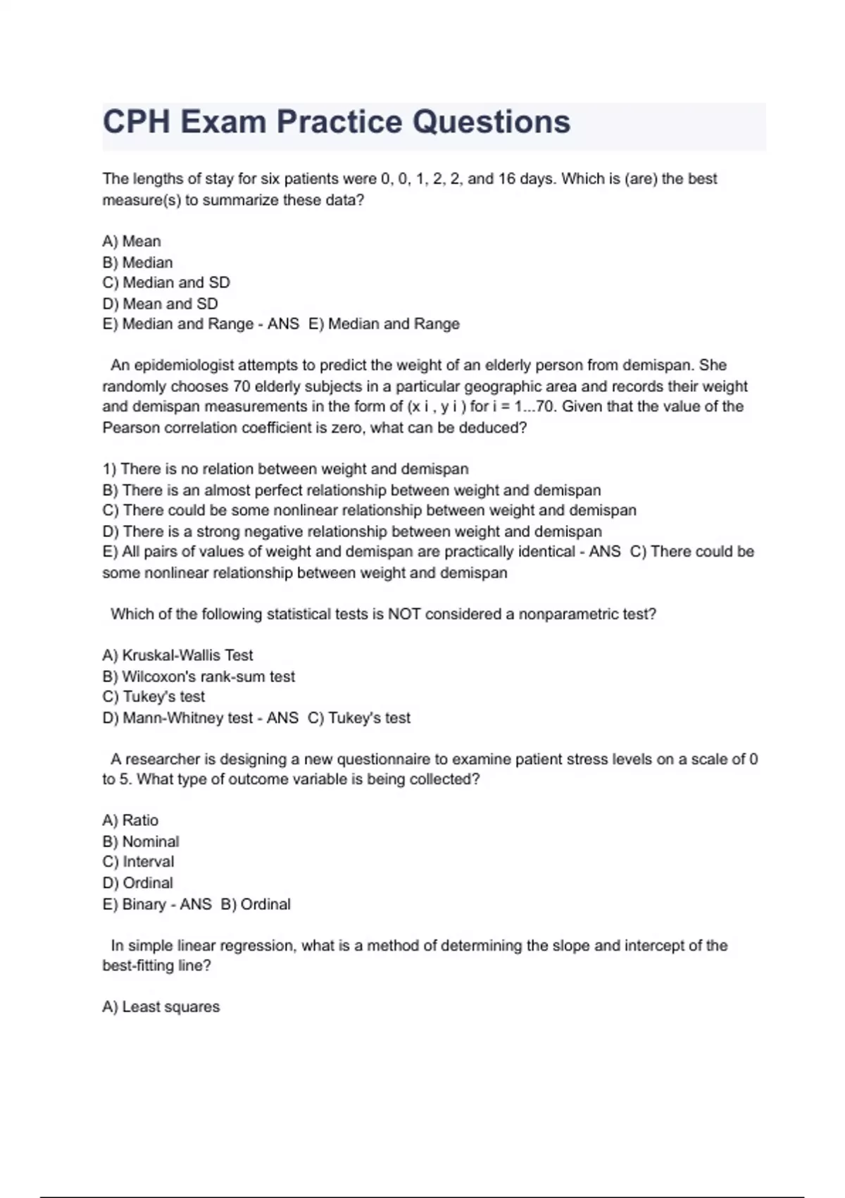 CPH Exam Practice Questions The lengths of stay for six patients were 0, 0, 1, 2, 2, and 16 days. Which is (are) the best measure(s) to summarize these data? A) Mean B) Median C) Median and SD D) Mean and SD E) Median and Range - ANS E) Median and Range An epidemiologist attempts to predict the weight of an elderly person from demispan. She randomly chooses 70 elderly subjects in a particular geographic area and records their weight and demispan measurements in the form of (x i , y i ) for i = 1...70. Given that the value of the Pearson correlation coefficient is zero, what can be deduced? 1) There is no relation between weight and demispan B) There is an almost perfect relationship between weight and demispan C) There could be some nonlinear relationship between weight and demispan D) There is a strong negative relationship between weight and demispan E) All pairs of values of weight and demispan are practically identical - ANS C) There could be some nonlinear relationship between weight and demispan Which of the following statistical tests is NOT considered a nonparametric test? A) Kruskal-Wallis Test B) Wilcoxon's rank-sum test C) Tukey's test D) Mann-Whitney test - ANS C) Tukey's test A researcher is designing a new questionnaire to examine patient stress levels on a scale of 0 to 5. What type of outcome variable is being collected? A) Ratio B) Nominal C) Interval D) Ordinal E) Binary - ANS B) Ordinal In simple linear regression, what is a method of determining the slope and intercept of the best-fitting line? A) Least squares B) R-square C) Minimum error D) Least Error E) Regression - ANS A) Least Squares The sensitivity of a particular screening test for a disease is 95%, and the specificity is 90%. Which of the following statements is most correct? (A) Of 100 people sampled from a population with the disease, the test will correctly detect 95 individuals as positive for the disease (B) Of 100 people sampled from a population with the disease, the test will correctly detect 90 individuals (C) If a person tests positive, the probability of having the disease is 0.95 (D) If a person has the disease, there is a 5% chance that the test will be negative (E) If a person does not have the disease, there is a 5% chance that the test will be positive - ANS A) Of 100 people samples from a population with the disease, the test will correctly detect 95 individuals as positive for the disease. Sensitivity is the proportion of truly diseased people in the screened population who are identified as diseased by the screening test. It is a measure of the probability of correctly diagnosing a case or the probability that any given case will be identified by the test (e.g., true positives). Specificity is the proportion of truly non-diseased people who are so identified by the screening test. It is a measure of the probability of correctly identifying a nondiseased person with the screening test (e.g., true negatives). The Central Limit Theorem states that: A) The sample mean is unbiased B) The sample mean is approximately normal C) The parent population of the sample distribution is normally distributed D) The sample SD is approximately normal E) Both statements A) and C) can be deduced from the Central Limit Theorem - ANS B) The sample mean is approximately normal The Central Limit Theorem states that if the sample size is large enough, the distribution of the sample means can be approximated by a normal distribution, even if the original population is not normally distributed. In other words, the distribution of the sample means approaches a normal distribution as the sample size increases Assume that a researcher has measured weight in a sample of 100 overweight adults before and after a diet and exercise program conducted at the local health department's weekly Eat Health - Be Fit community program. To determine whether the mean weight decreased six weeks after the exercise program compared to the initial baseline measures, the researcher should: A) Compute the correlation coefficient, r, and determine the association between being overweight and the community program B) Conduct a t-test for independent samples C) Conduct a t-test for dependent samples D) Conduct a chi-square test for association E) Not estimate the decrease because there was no control group for the program - ANS C) Conduct a t-test for dependent samples A t-test is a hypothesis test to compare population means and proportions. In this case, the sample is dependent because the tests are performed on the same individuals in the sample. Which of the following estimates of an odds ratio most strongly suggests a computational error? 1) 7.8 2) 1.2 3) -0.9 4) 20.9 - ANS 3) -0.9 An odds ratio of -0.9 most strongly indicates a computational error because an odds ratio is calculated using probabilities, which cannot be negative. An odds ratio is the probability that an event will occur divided by the probability that it will not occur. Since probabilities cannot be negative, a negative odds ratio would indicate computational error. Which measure of mortality would you calculate to determine the proportion of all deaths that is caused by heart disease? A) Case Fatality Ratio B) Randomized Clinical Trial C) Crude Mortality Rate D) Proportional Mortality Ratio - ANS D) Proportional Mortality Ratio the proportion of deaths in a particular population over a specified period of time attributable to a specific disease An incremental approach to program planning in public health is: 1) Uses multiple sources and methods to collect similar information 2) Provides an intensive, detailed description and analysis of a single project 3) Produces a plan where the specification of every step depends up on the results of previous steps 4) Results in plans that may be immediately necessary but may overlap or leave gaps - ANS 4) Results in plans that may be immediately necessary but may overlap or leave gaps