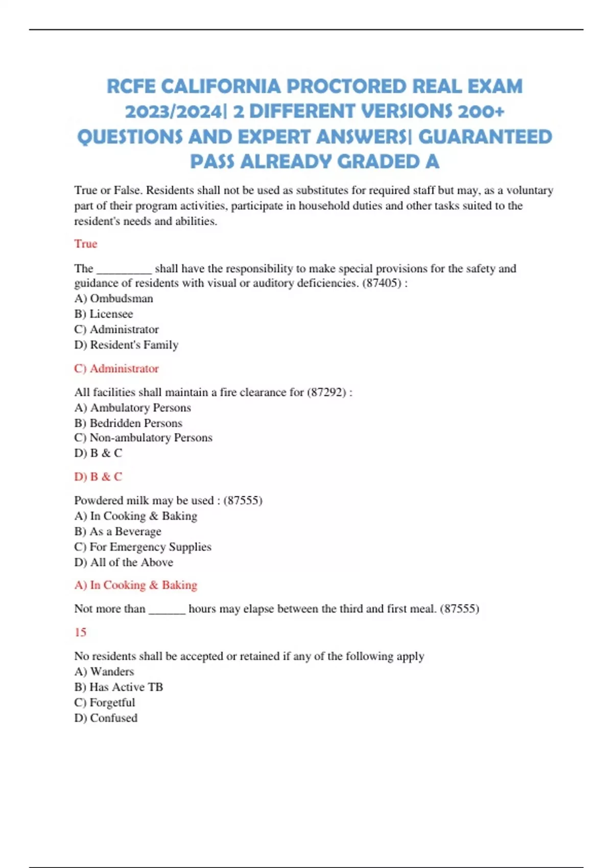 RCFE CALIFORNIA PROCTORED REAL EXAM 2023/2024| 2 DIFFERENT VERSIONS 200+ QUESTIONS AND EXPERT ANSWERS| GUARANTEED PASS ALREADY GRADED A