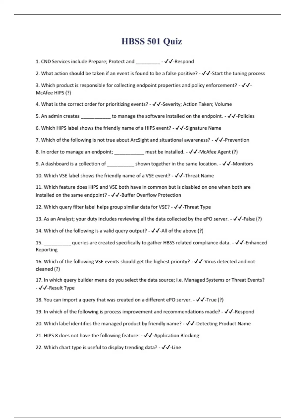 1. CND Services include Prepare; Protect and _________ - -Respond 2. What action should be taken if an event is found to be a false positive? - -Start the tuning process 3. Which product is responsible for collecting endpoint properties and policy enforcement? - - McAfee HIPS (?) 4. What is the correct order for prioritizing events? - -Severity; Action Taken; Volume 5. An admin creates ___________ to manage the software installed on the endpoint. - -Policies 6. Which HIPS label shows the friendly name of a HIPS event? - -Signature Name 7. Which of the following is not true about ArcSight and situational awareness? - -Prevention 8. In order to manage an endpoint; ___________ must be installed. - -McAfee Agent (?) 9. A dashboard is a collection of __________ shown together in the same location. - -Monitors 10. Which VSE label shows the friendly name of a VSE event? - -Threat Name 11. Which feature does HIPS and VSE both have in common but is disabled on one when both are installed on the same endpoint? - -Buffer Overflow Protection 12. Which query filter label helps group similar data for VSE? - -Threat Type 13. As an Analyst; your duty includes reviewing all the data collected by the ePO server. - -False (?) 14. Which of the following is a valid query output? - -All of the above (?) 15. __________ queries are created specifically to gather HBSS related compliance data. - -Enhanced Reporting 16. Which of the following VSE events should get the highest priority? - -Virus detected and not cleaned (?) 17. In which query builder menu do you select the data source; i.e. Managed Systems or Threat Events? - -Result Type 18. You can import a query that was created on a different ePO server. - -True (?) 19. In which of the following is process improvement and recommendations made? - -Respond 20. Which label identifies the managed product by friendly name? - -Detecting Product Name 21. HIPS 8 does not have the following feature: - -Application Blocking 22. Which chart type is useful to display trending data? - -Line