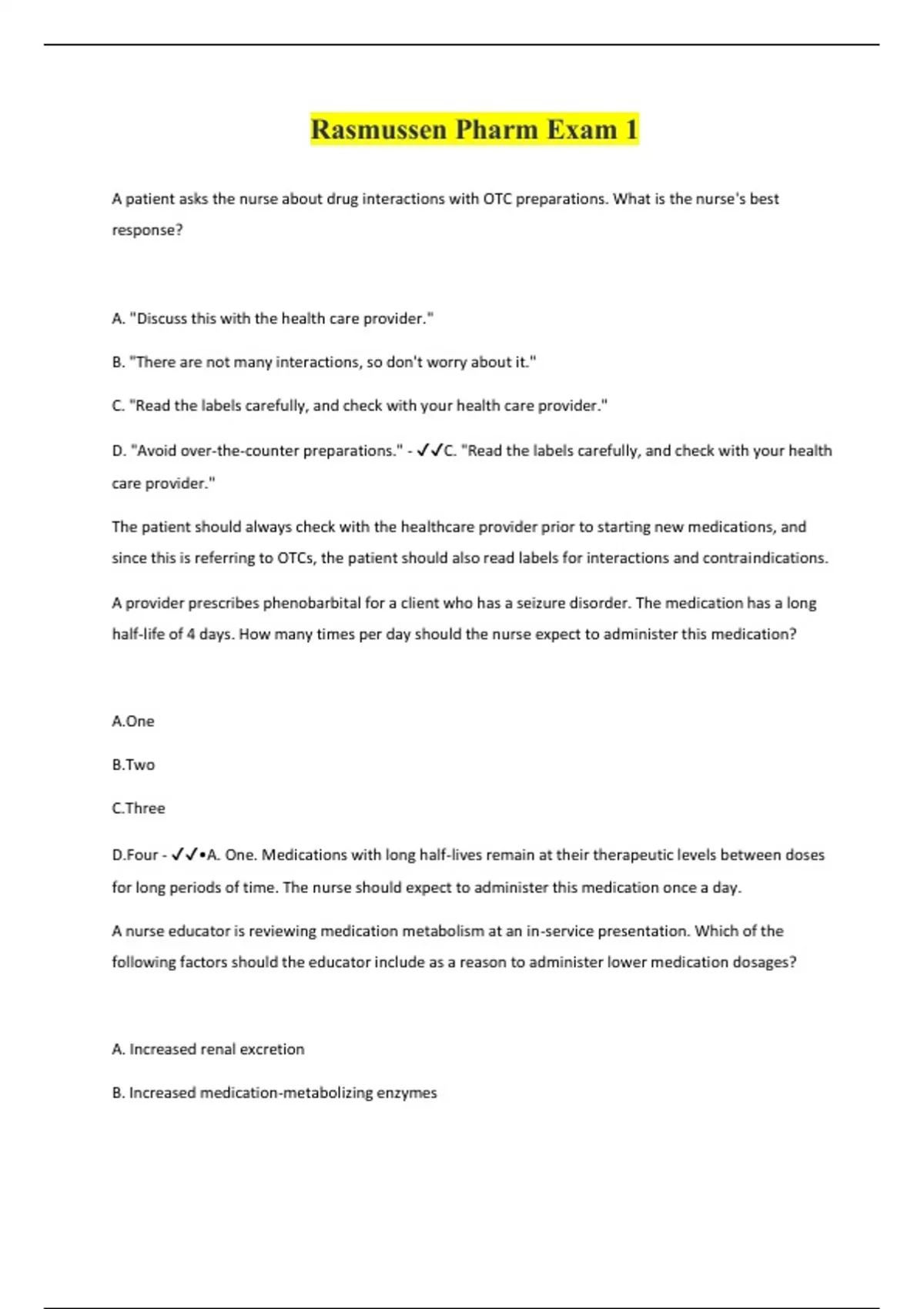 A patient asks the nurse about drug interactions with OTC preparations. What is the nurse's best response? A. "Discuss this with the health care provider." B. "There are not many interactions, so don't worry about it." C. "Read the labels carefully, and check with your health care provider." D. "Avoid over-the-counter preparations." - C. "Read the labels carefully, and check with your health care provider." The patient should always check with the healthcare provider prior to starting new medications, and since this is referring to OTCs, the patient should also read labels for interactions and contraindications. A provider prescribes phenobarbital for a client who has a seizure disorder. The medication has a long half-life of 4 days. How many times per day should the nurse expect to administer this medication? A.One B.Two C.Three D.Four - •A. One. Medications with long half-lives remain at their therapeutic levels between doses for long periods of time. The nurse should expect to administer this medication once a day. A nurse educator is reviewing medication metabolism at an in-service presentation. Which of the following factors should the educator include as a reason to administer lower medication dosages? A. Increased renal excretion B. Increased medication-metabolizing enzymes