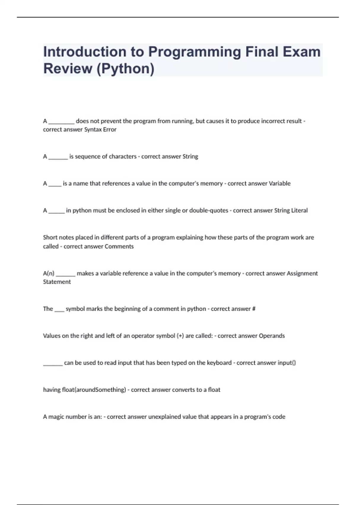 Introduction to Programming Final Exam Review (Python) with verified correct answers 2023
