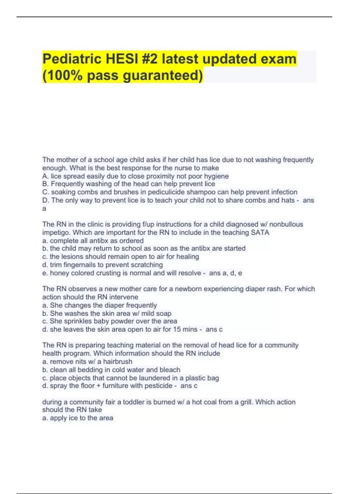 Pediatric HESI #2 latest updated exam (100% pass guaranteed) The mother of a school age child asks if her child has lice due to not washing frequently enough. What is the best response for the nurse to make A. lice spread easily due to close proximity not poor hygiene B. Frequently washing of the head can help prevent lice C. soaking combs and brushes in pediculicide shampoo can help prevent infection D. The only way to prevent lice is to teach your child not to share combs and hats - The RN in the clinic is providing f/up instructions for a child diagnosed w/ nonbullous impetigo. Which are important for the RN to include in the teaching SATA a. complete all antibx as ordered b. the child may return to school as soon as the antibx are started c. the lesions should remain open to air for healing d. trim fingernails to prevent scratching e. honey colored crusting is normal and will resolve - The RN observes a new mother care for a newborn experiencing diaper rash. For which action should the RN intervene a. She changes the diaper frequently b. She washes the skin area w/ mild soap c. She sprinkles baby powder over the area d. she leaves the skin area open to air for 15 mins - The RN is preparing teaching material on the removal of head lice for a community health program. Which information should the RN include a. remove nits w/ a hairbrush b. clean all bedding in cold water and bleach c. place objects that cannot be laundered in a plastic bag d. spray the floor + furniture with pesticide - during a community fair a toddler is burned w/ a hot coal from a grill. Which action should the RN take a. apply ice to the area b. place the area in cool water c. break the blisters and apply ice over the area d/ wash the area w/ large amounts of warm water - The RN is visiting a home of a client who delivered a full term infant 2 days ago. For which home safety observation should the RN make a recommendation a. a guardrail placed in front of the fireplace alarms installed and functioning in all rooms c. a fire extinguisher located at the entrance to the kitchen d. the mother holds the infant while pouring water for hot tea - the RN is providing parent education about how to best treat a diaper rash. Which statement made by the parents indicate that they need further teaching a. I should only change the babys diaper once per day b. I should apply a protective cream to the diaper area c. I should let the diaper area dry for a few mins before applying a new diaper d. I should monitor for signs of infection if the diaper rash is severe - A RN is providing education to parents of school children w/ pediculosis capitis. Which statement about treating pediculosis if made by the parent would indicate a need for further teaching a. we will be sure to wash my childs bedding after using the shampoo b. my childs toys will need to be bagged for at least 2 weeks and the nwashed c. my child will need to continue to use the shampoo for 2mos d. we will soak our childs combs and brushes in hot water and the shampoo - A RN is reviewing home care instructions to parents of a child diagnosed w/ cellulitis of the forearm. Which important teaching about cellulitis should be included in the home care instructions a. cellulitis is an auto-immune disorder b. Cellulitis is always caused by MRSA c. parents and caregicers should seek medical help for increased fever or for increasing redness, streaking and pain and swelling at the infection site d. cellulitis always needs to be treated w/ IV antibx ..................................................continued...............................................................................
