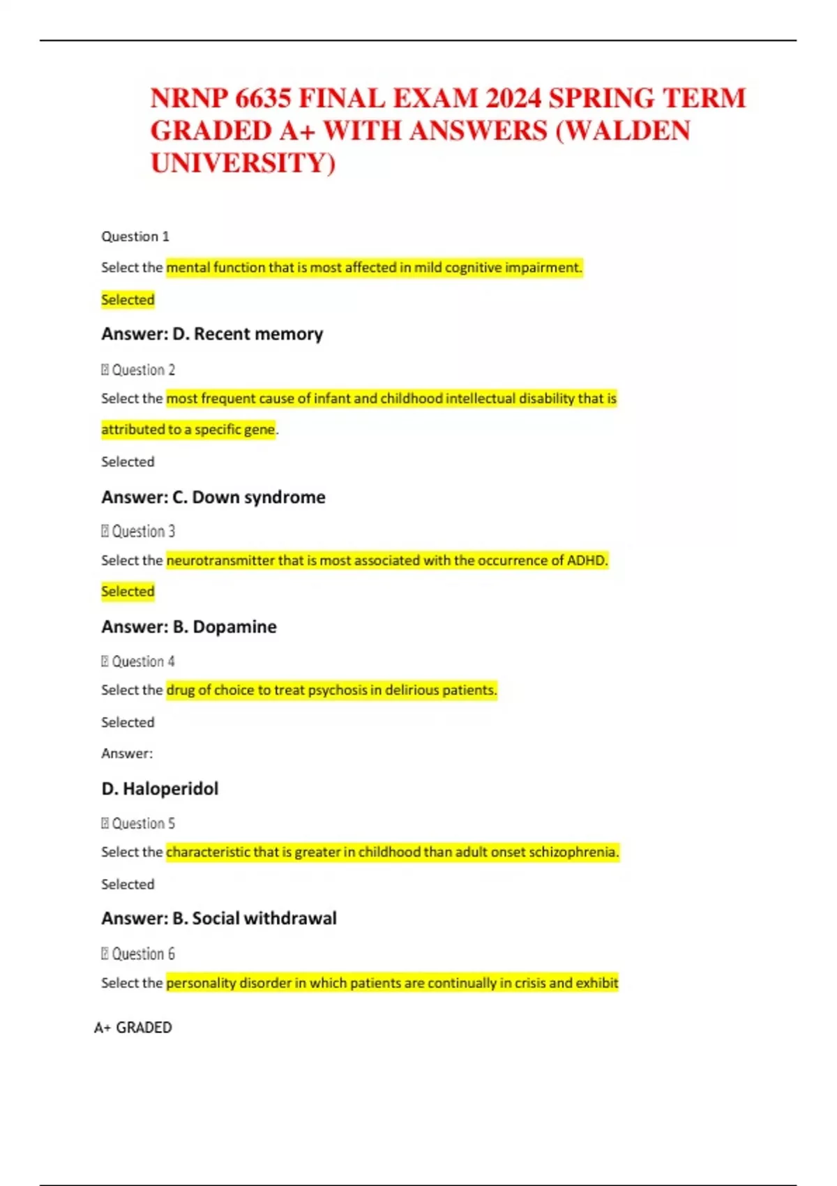 NRNP 6635 FINAL EXAM 2024 SPRING TERM GRADED A+ WITH ANSWERS (WALDEN UNIVERSITY)