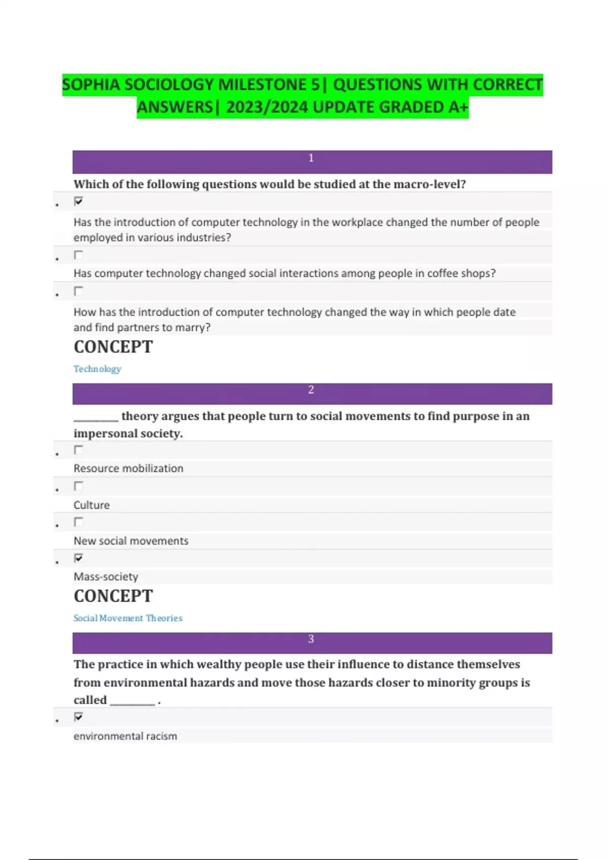 SOPHIA SOCIOLOGY MILESTONE 5| QUESTIONS WITH CORRECT ANSWERS| 2023/2024 UPDATE GRADED A+ 1 Which of the following questions would be studied at the macro-level? • Has the introduction of computer technology in the workplace changed the number of people employed in various industries? • Has computer technology changed social interactions among people in coffee shops? • How has the introduction of computer technology changed the way in which people date and find partners to marry? CONCEPT Technology 2 __________ theory argues that people turn to social movements to find purpose in an impersonal society. • Resource mobilization • Culture • New social movements • Mass-society