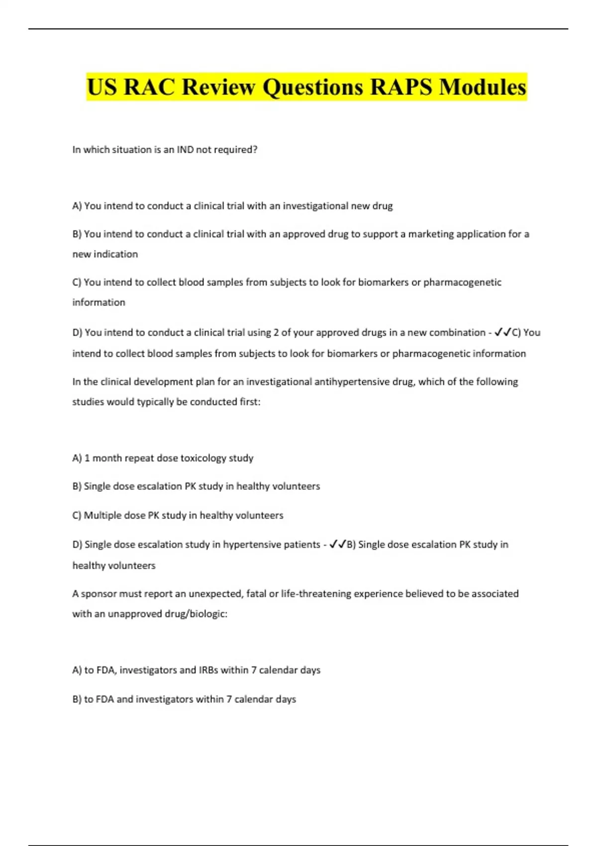 In which situation is an IND not required? A) You intend to conduct a clinical trial with an investigational new drug B) You intend to conduct a clinical trial with an approved drug to support a marketing application for a new indication C) You intend to collect blood samples from subjects to look for biomarkers or pharmacogenetic information D) You intend to conduct a clinical trial using 2 of your approved drugs in a new combination - C) You intend to collect blood samples from subjects to look for biomarkers or pharmacogenetic information In the clinical development plan for an investigational antihypertensive drug, which of the following studies would typically be conducted first: A) 1 month repeat dose toxicology study B) Single dose escalation PK study in healthy volunteers C) Multiple dose PK study in healthy volunteers D) Single dose escalation study in hypertensive patients - B) Single dose escalation PK study in healthy volunteers A sponsor must report an unexpected, fatal or life-threatening experience believed to be associated with an unapproved drug/biologic: A) to FDA, investigators and IRBs within 7 calendar days B) to FDA and investigators within 7 calendar days