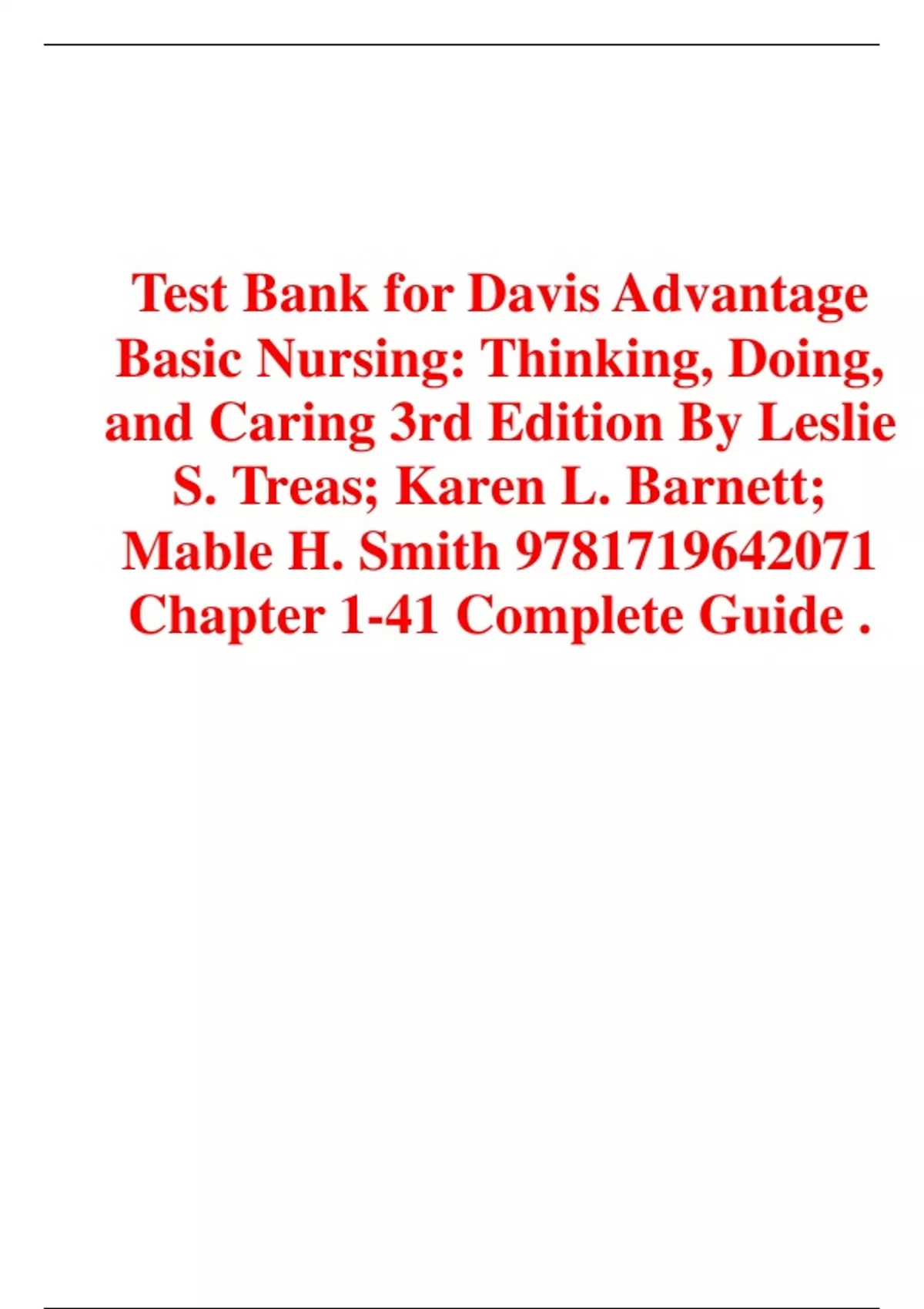 Test Bank for Davis Advantage Basic Nursing: Thinking, Doing, and Caring 3rd Edition By Leslie S. Treas; Karen L. Barnett; Mable H. Smith 9781719642071 Chapter 1-41 Complete Guide